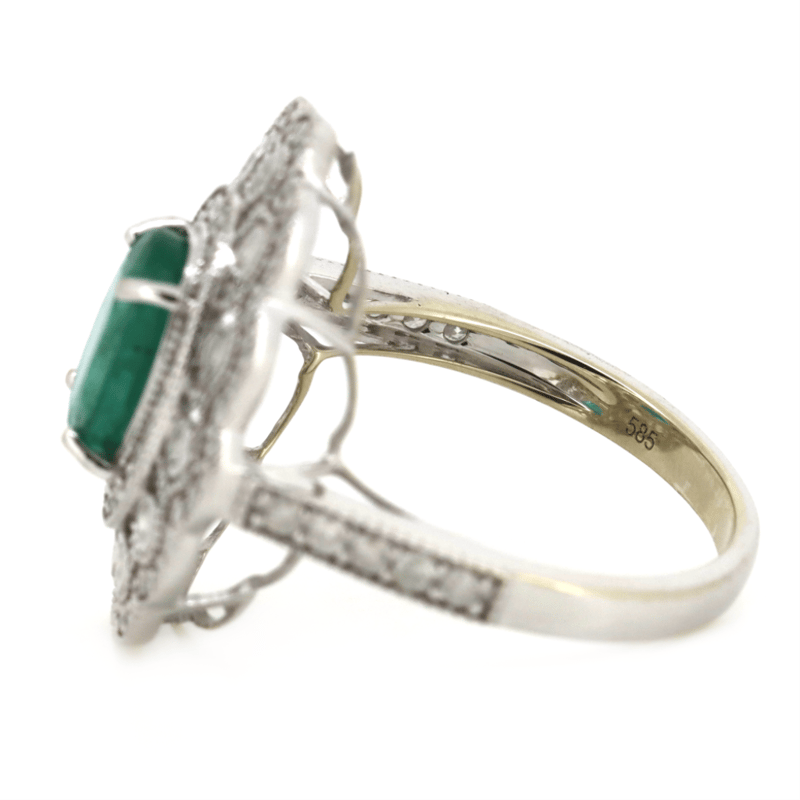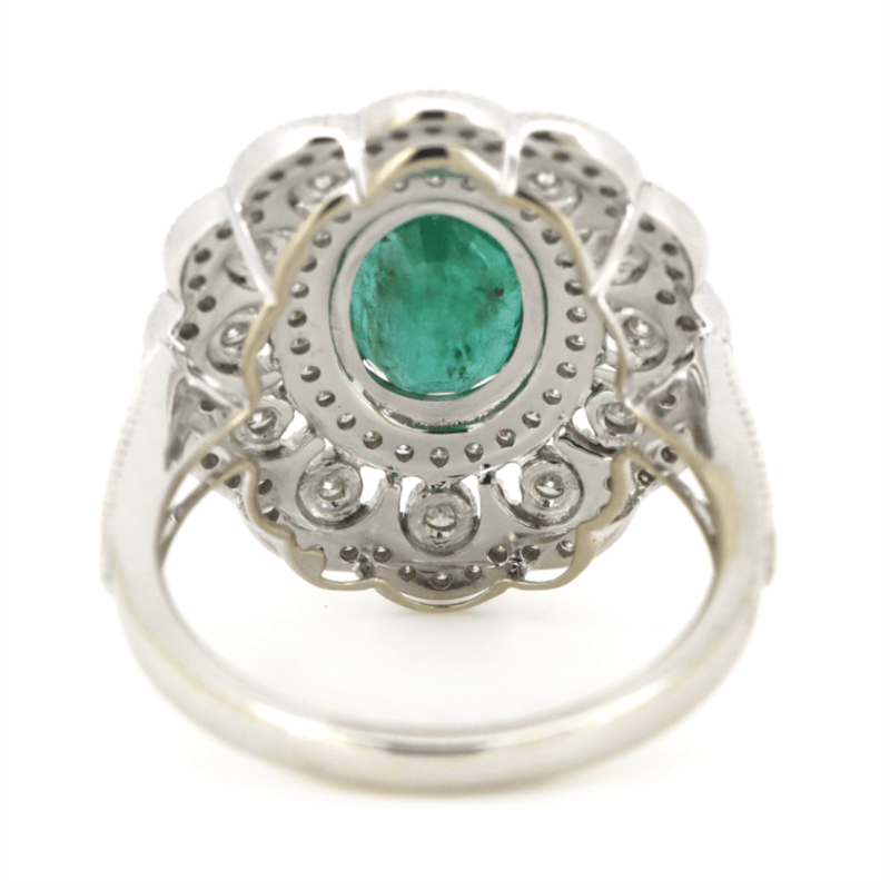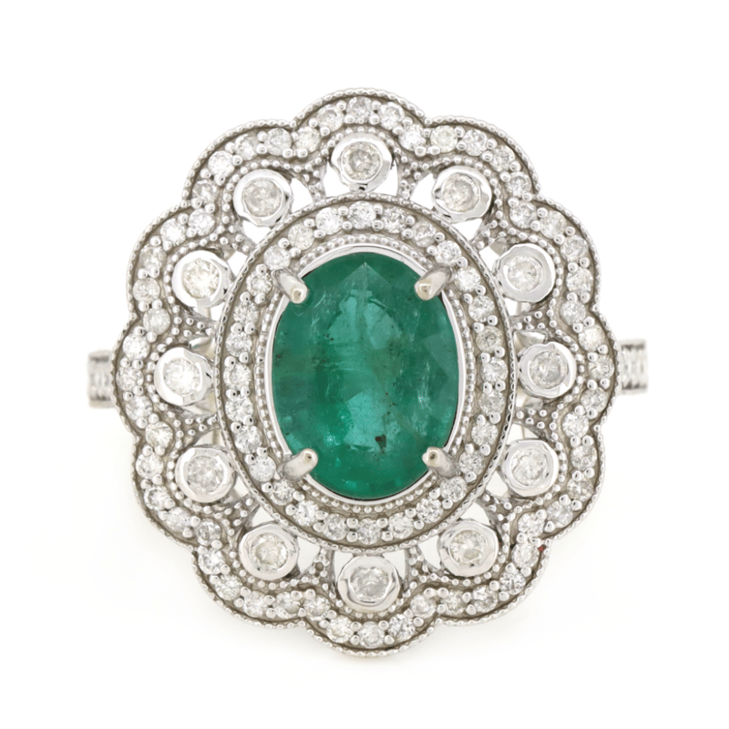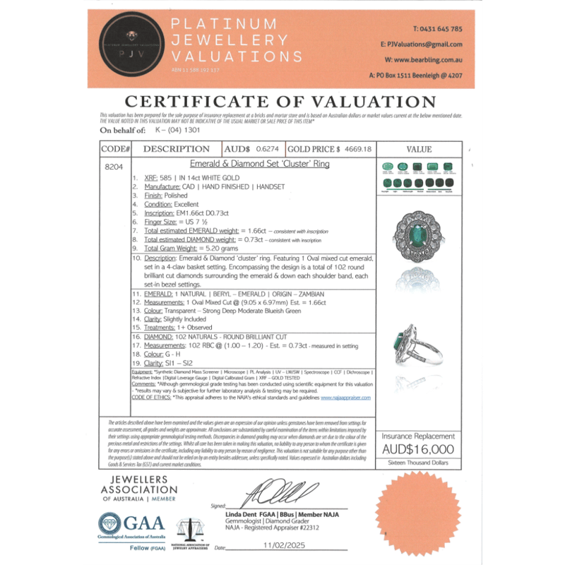 14K WHITE GOLD, EMERALD AND DIAMOND, CLUSTER RING. THE CENTRE FEATURES, ONE OVAL MODIFIED BRILLIANT CUT, STRONG DEEP MODERATE BLUISH-GREEN, EMERALD (1.66CT, SLIGHTLY INCLUDED), 4 CLAW SET. SURROUNDING THE CENTRE ARE, 102 ROUND BRILLIANT CUT, DIAMONDS (0.73CT TDW, G-H COLOUR, SI1-SI2 CLARITY), BEZEL SET. RING SIZE O 1/2. Valuations Provided by an Independent Third-Party Professional Not Directly Associated With Lloyds Auctions at AUD $16,000.00This valuation has been conducted by an independent third-party professional. The valuation amount is an assessment by the issuing valuer and does not reflect the auction value of the item. Any inquiries regarding the valuation should be directed to the issuing valuer (refer to contact details on the certificate), as Lloyds Auctions has no affiliation or influence over the valuation, the valuer, or the stated amount. Condition: Good - Refer Images 0645880+248