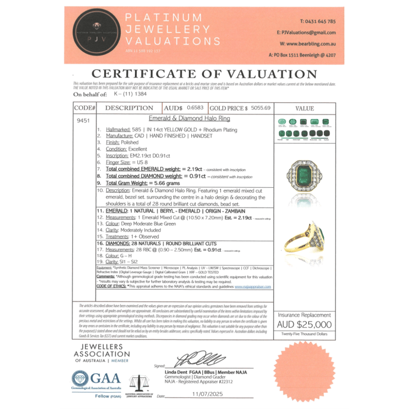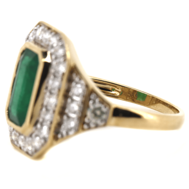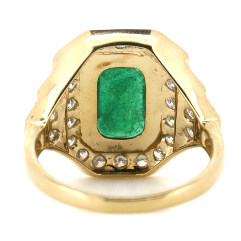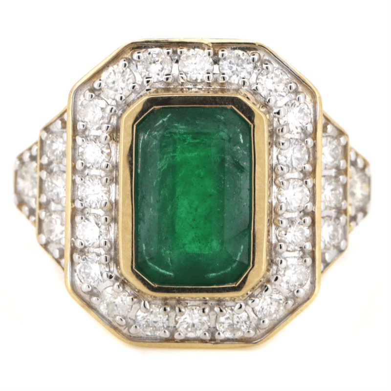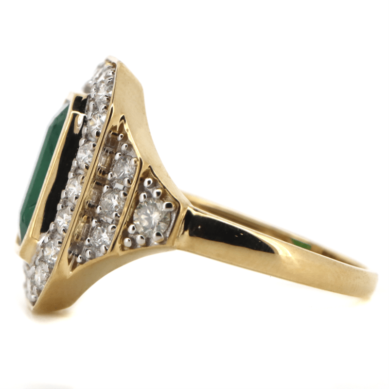 14K YELLOW GOLD, EMERALD AND DIAMOND, HALO RING. THE CENTRE FEATURES, ONE EMERALD CUT, EMERALD (2.19CT, MODERATELY INCLUDED), BEZEL SET. SURROUNDING THE CENTRE IN A HALO AND DECORATING THE SHOULDERS ARE, 28 ROUND BRILLIANT CUT, DIAMONDS (0.91CT TDW, G-H COLOUR, SI1-SI2 CLARITY), BEAD SET. RING SIZE P 1/2.