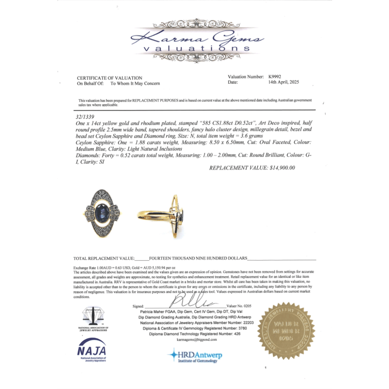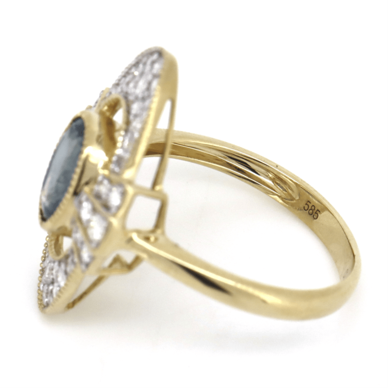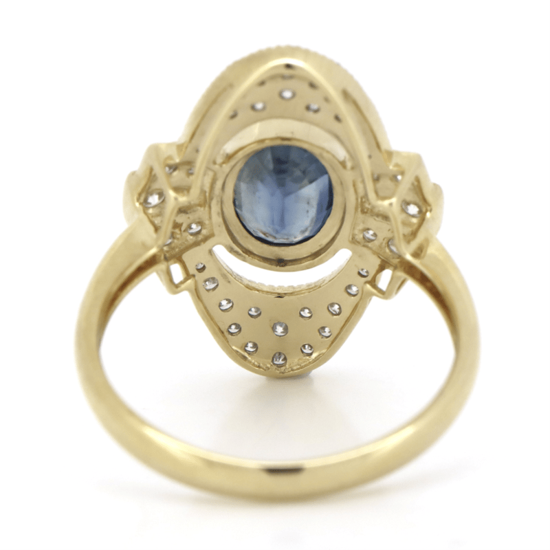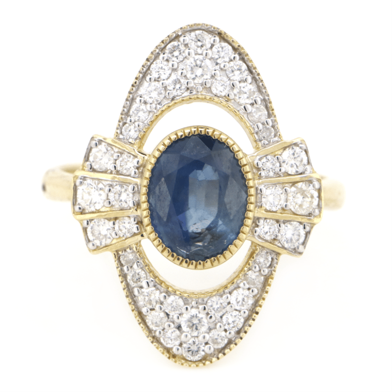 14K YELLOW GOLD, 1.88CT BLUE CEYLON SAPPHIRE AND DIAMOND, ART DECO INSPIRED RING. THE CENTRE FEATURES, ONE OVAL BRILLIANT CUT, MEDIUM BLUE, CEYLON SAPPHIRE (1.88CT, LIGHT NATURAL INCLUSIONS), BEZEL SET WITH MILLEGRAIN DETAIL. ENCOMPASSING THE CENTRE ARE, 40 ROUND BRILLIANT CUT DIAMONDS (0.52CT TDW, G-I COLOUR, SI CLARITY), MICRO-BEAD SET WITH MILLEGRAIN DETAIL. RING SIZE N.