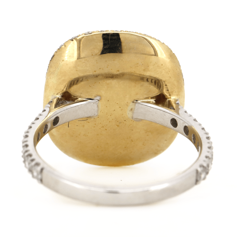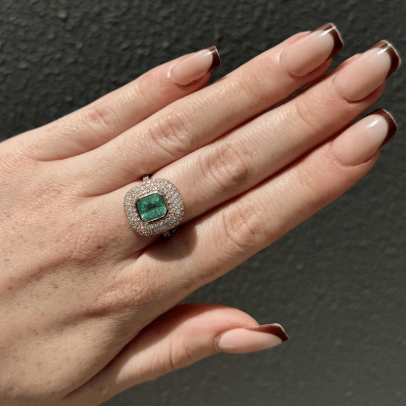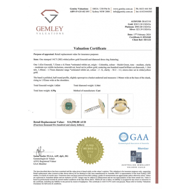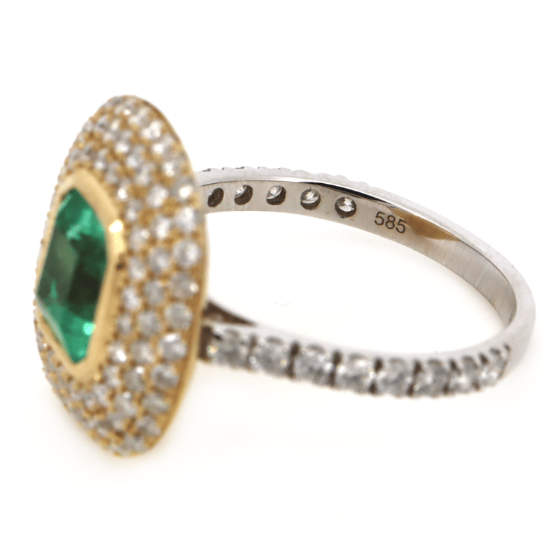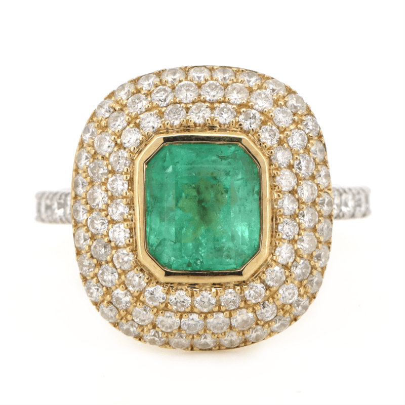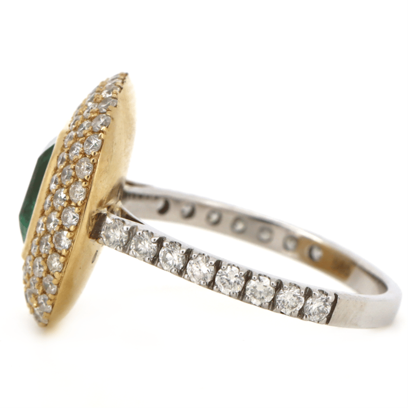 14K WHITE/YELLOW GOLD, 1.62CT COLOMBIAN EMERALD AND DIAMOND, CLUSTER RING. THE CENTRE FEATURES, ONE EMERALD CUT, BLUISH GREEN, COLOMBIAN EMERALD (1.62CT, MODERATE EYE VISIBLE INCLUSIONS), BEZEL SET IN YELLOW GOLD. SURROUNDING THE CENTRE IN A CLUSTER ARE, 100 ROUND BRILLIANT CUT, DIAMONDS (1.16CT TDW, J-K COLOUR, SI2-I2 CLARITY), MICRO-CLAW SET IN WHITE/YELLOW GOLD. RING SIZE M.