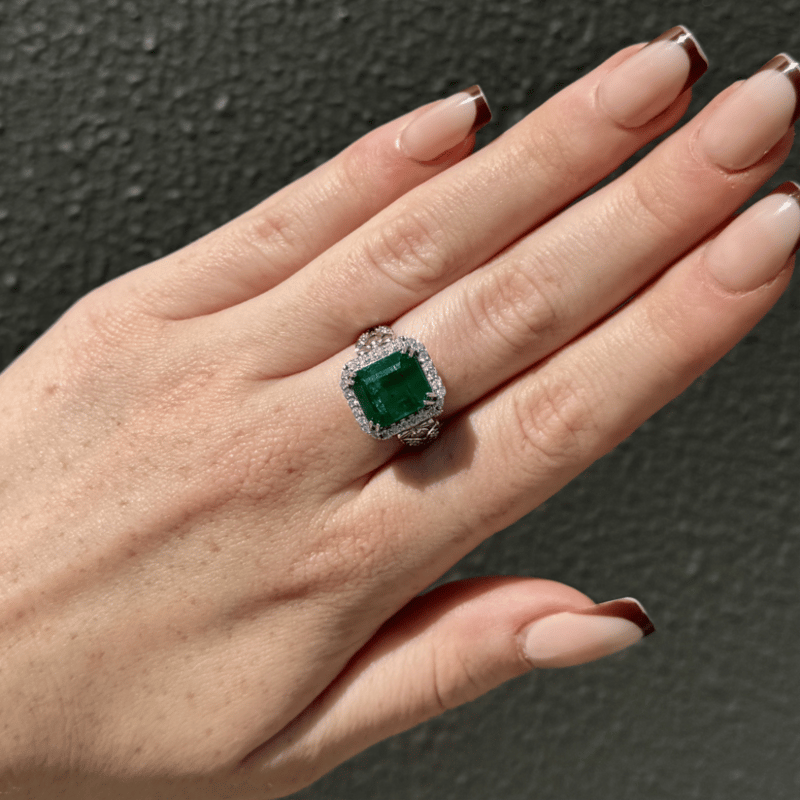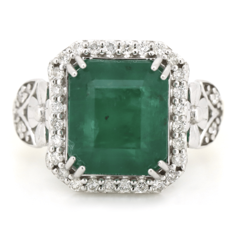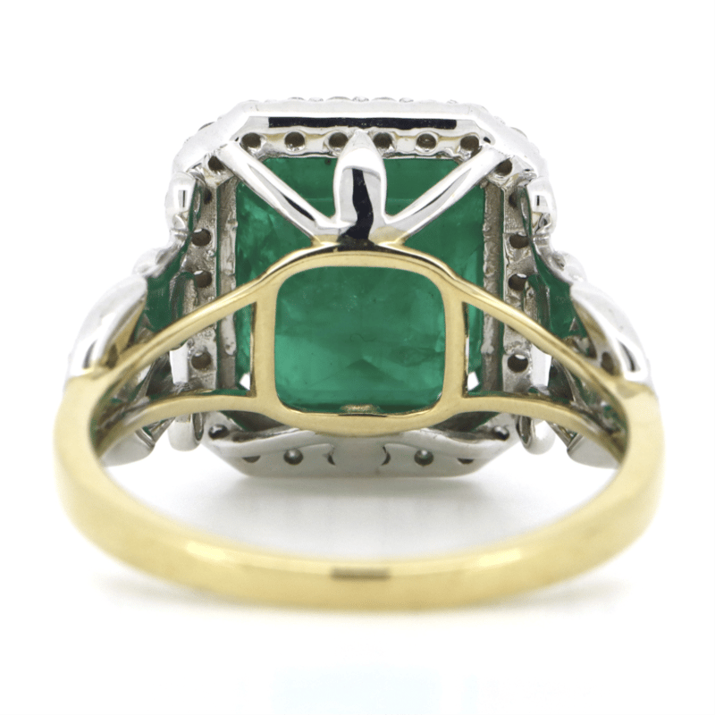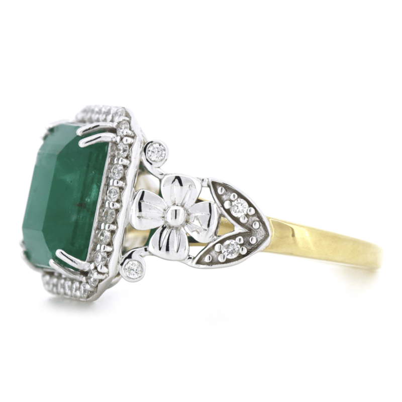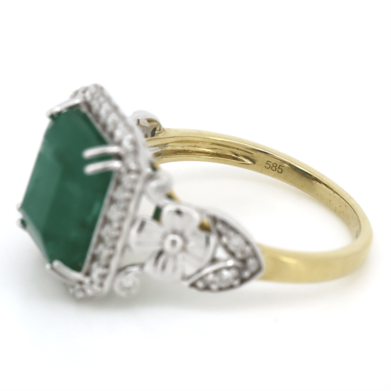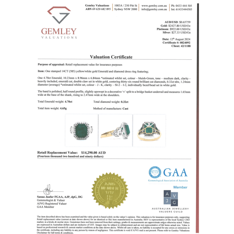 14K YELLOW/WHITE GOLD, EMERALD AND DIAMOND, HALO RING. THE CENTRE FEATURES, ONE EMERALD CUT, BLUISH-GREEN, EMERALD (4.70CT, HEAVILY INCLUDED), DOUBLE 4 CLAW SET. SURROUNDING THE CENTRE IN A HALO AND DECORATING SETTINGS ARE, 36 ROUND BRILLIANT CUT, DIAMONDS (0.32CT TDW, J-K COLOUR, SI2-I2 CLARITY), BEZEL/BEAD SET. RING SIZE N. Valuations Provided by an Independent Third-Party Professional Not Directly Associated With Lloyds Auctions at AUD $14,290.00This valuation has been conducted by an independent third-party professional. The valuation amount is an assessment by the issuing valuer and does not reflect the auction value of the item. Any inquiries regarding the valuation should be directed to the issuing valuer (refer to contact details on the certificate), as Lloyds Auctions has no affiliation or influence over the valuation, the valuer, or the stated amount. Condition: Good - Refer Images 0645880+266