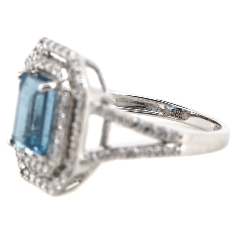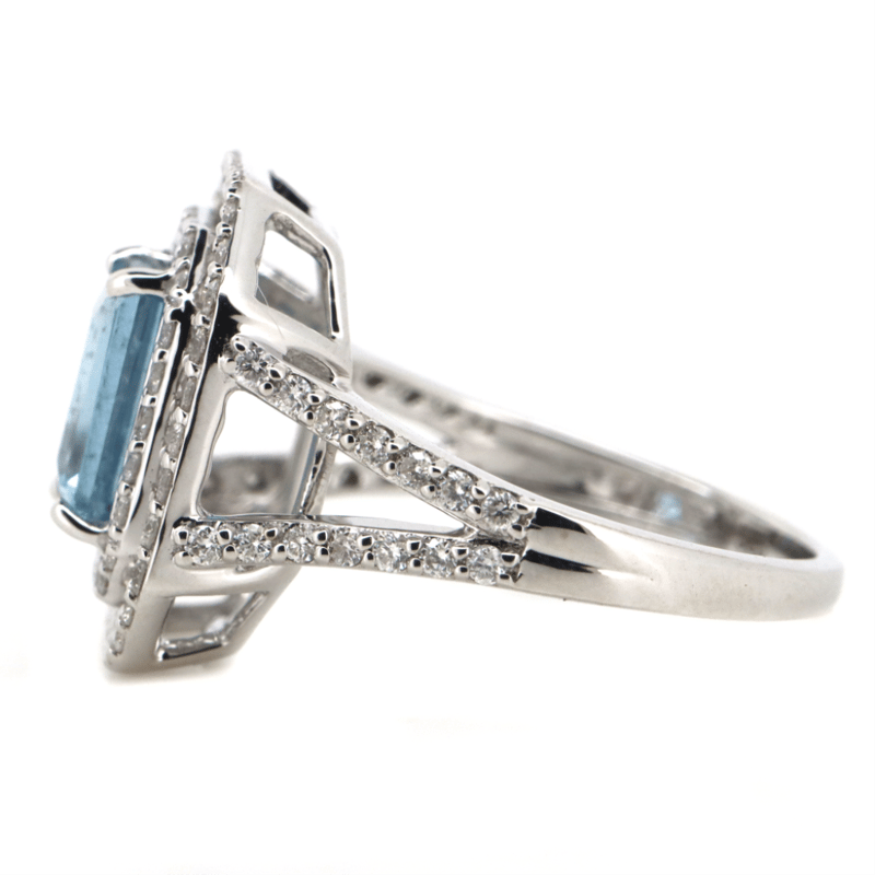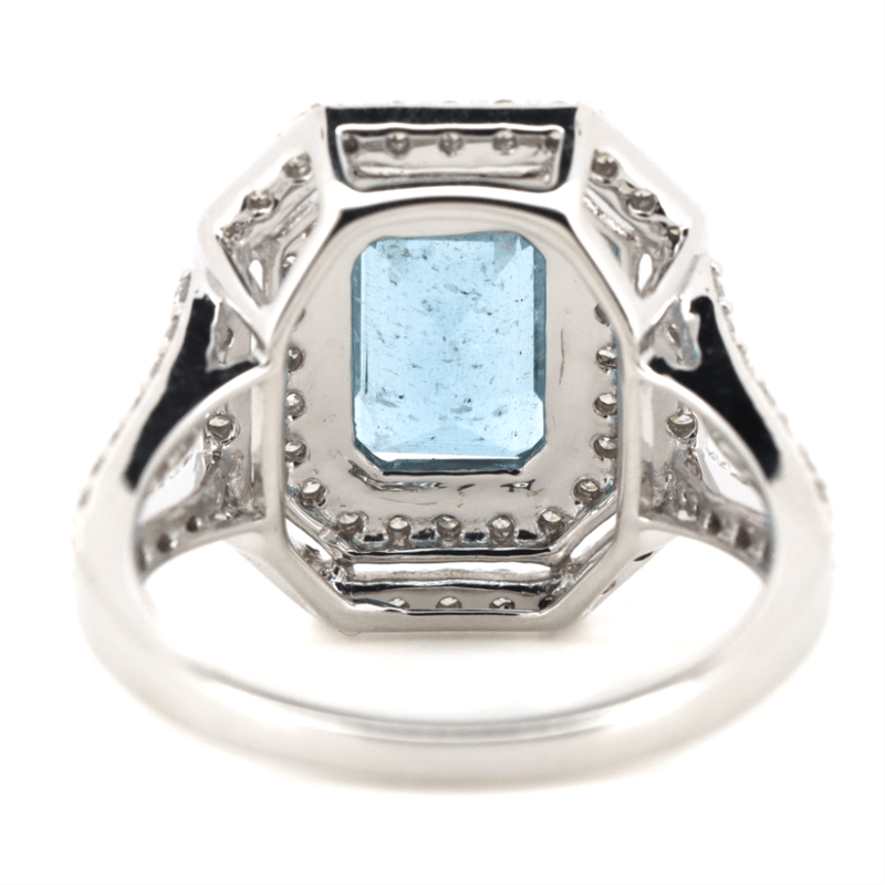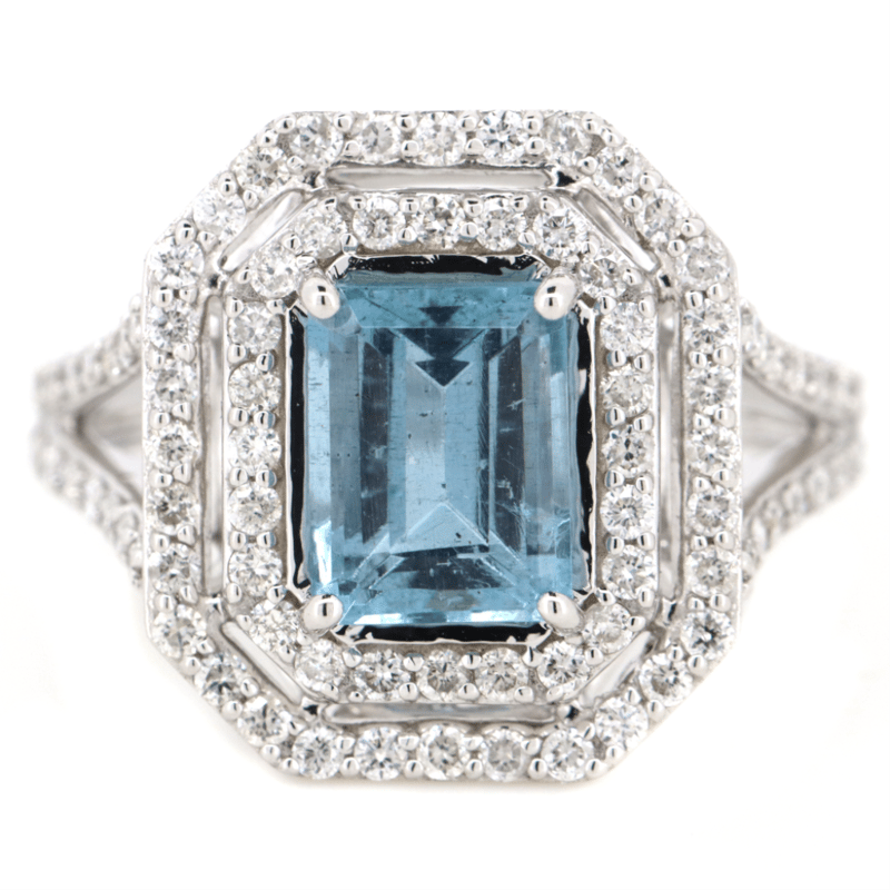 14K WHITE GOLD, AQUAMARINE AND DIAMOND, DOUBLE HALO RING. THE CENTRE FEATURES, ONE EMERALD CUT, AQUAMARINE (1.78CT, SLIGHTLY INCLUDED), CLAW SET. SURROUNDING THE CENTRE IN A DOUBLE HALO AND DECORATING THE SPLIT BAND ARE, 84 ROUND BRILLIANT CUT, DIAMONDS (0.71CT TDW, G-H COLOUR, SI1-SI2 CLARITY), MICRO-CLAW SET. RING SIZE L 1/2.