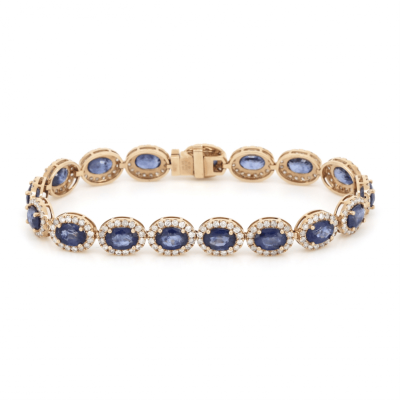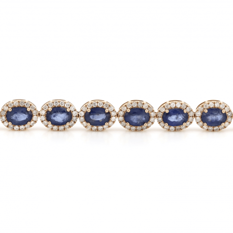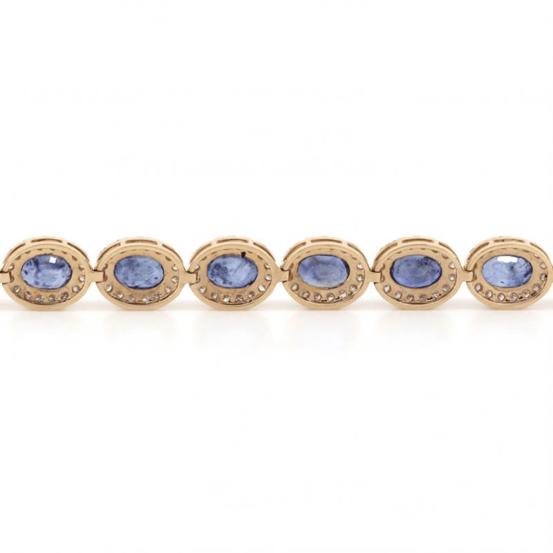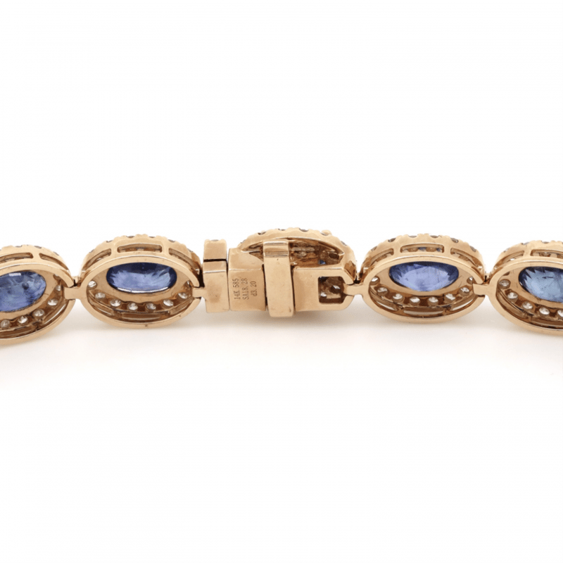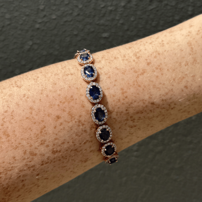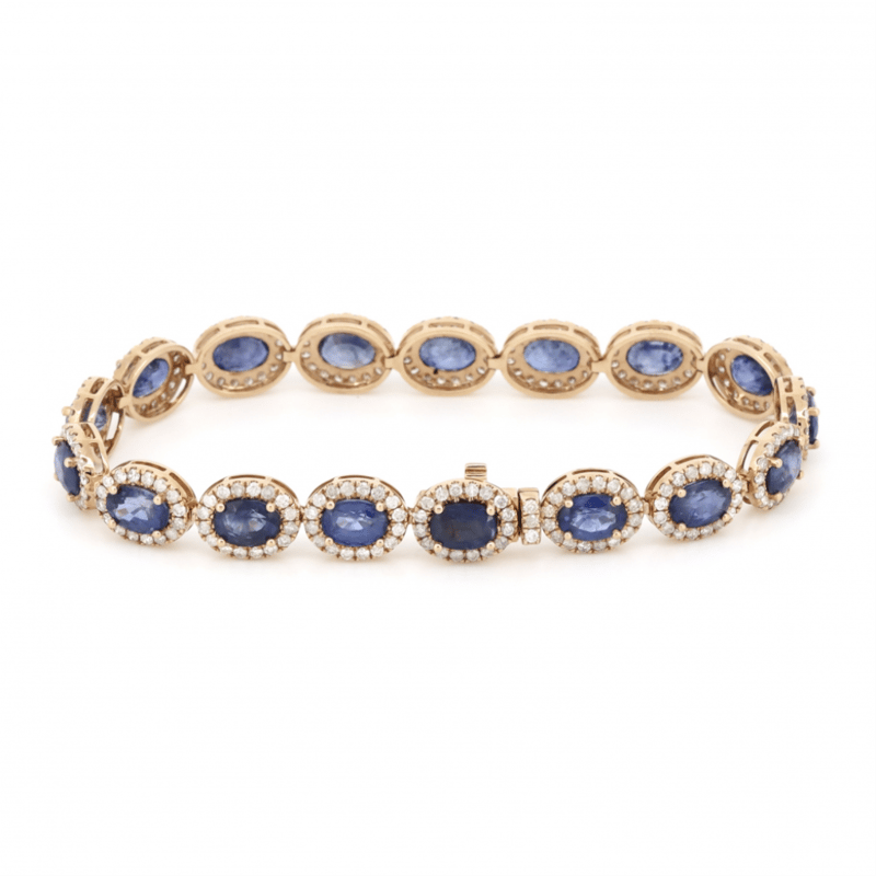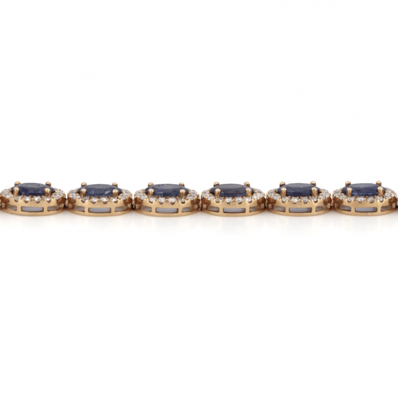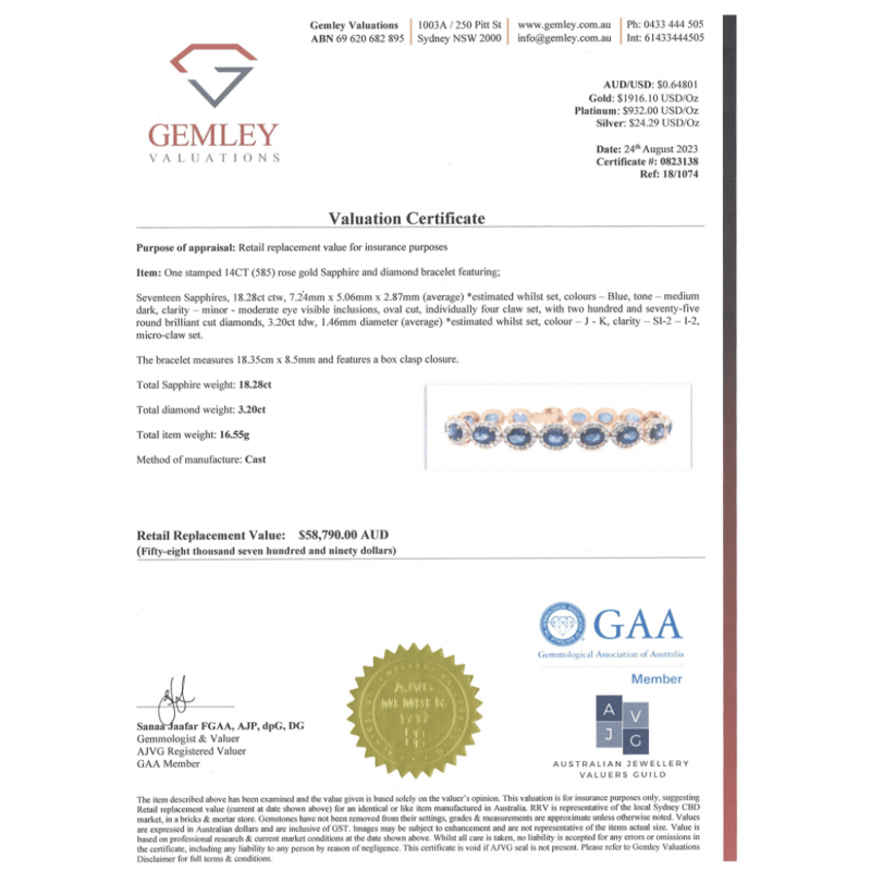 14K ROSE GOLD, BLUE SAPPHIRE AND DIAMOND, HALO BRACELET. THE DESIGN FEATURES, 17 OVAL CUT, MEDIUM-DARK BLUE, SAPPHIRES (18.28CT TSW, MINOR - MODERATE EYE VISIBLE INCLUSIONS), CLAW SET. SURROUNDING THE STONES IN HALOS AND DECORATING THE CLASP ARE, 275 ROUND BRILLIANT CUT, DIAMONDS (3.20CT TDW, J-K COLOUR, SI2-I2 CLARITY), MICRO-CLAW SET. THE BRACELET HAS A BOX LOCK CLASP, WITH ONE SAFETY LATCH. BRACELET LENGTH IS 18.5CM. Valuations Provided by an Independent Third-Party Professional Not Directly Associated With Lloyds Auctions at AUD $58,790.00This valuation has been conducted by an independent third-party professional. The valuation amount is an assessment by the issuing valuer and does not reflect the auction value of the item. Any inquiries regarding the valuation should be directed to the issuing valuer (refer to contact details on the certificate), as Lloyds Auctions has no affiliation or influence over the valuation, the valuer, or the stated amount. Condition: Good - Refer Images 0645880+260