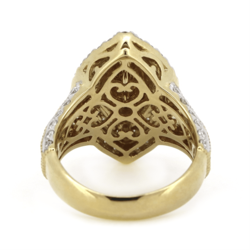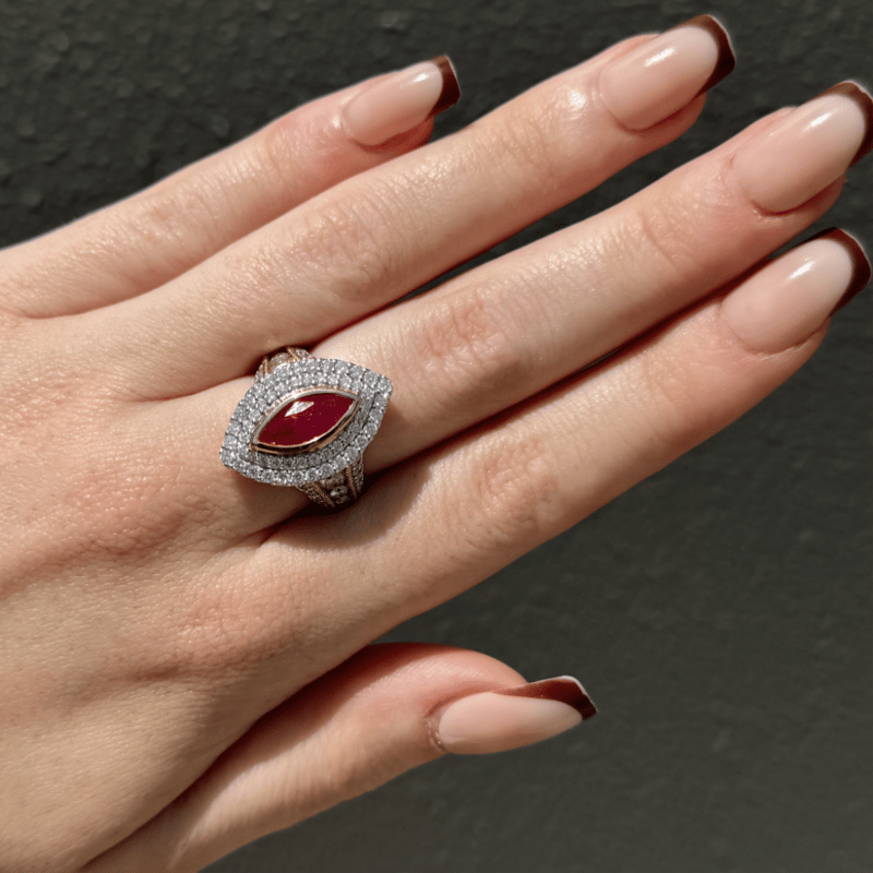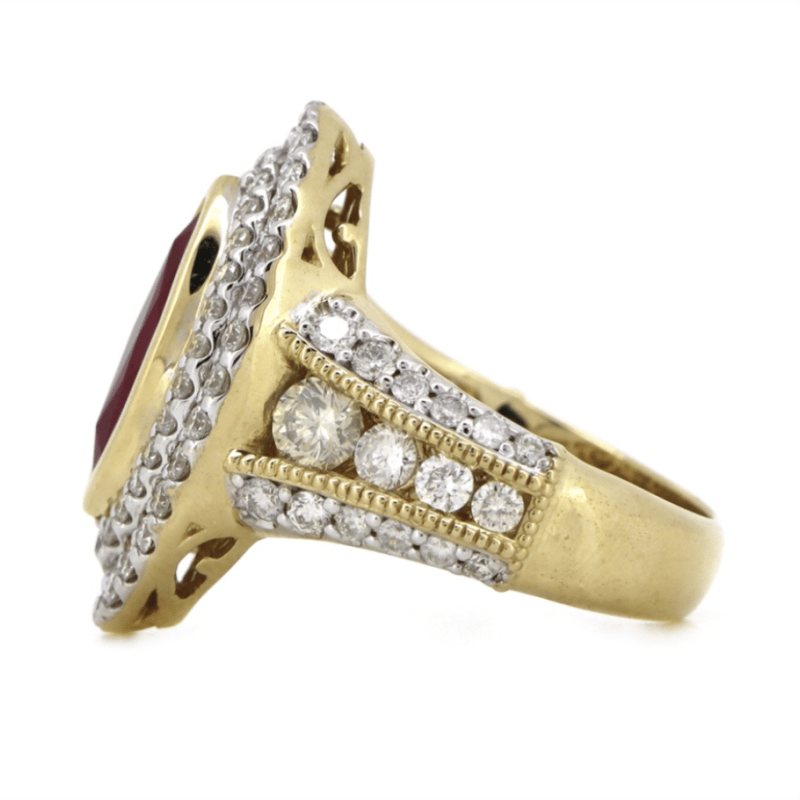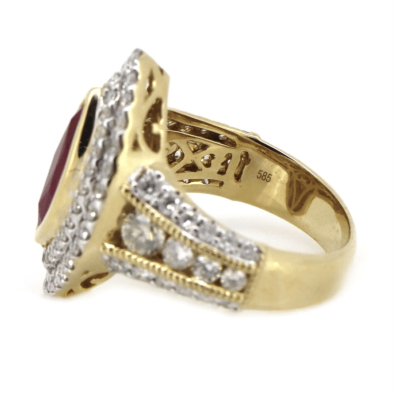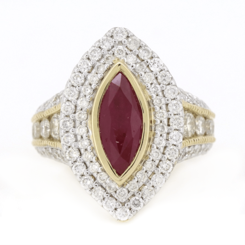14K YELLOW GOLD, RUBY AND DIAMOND, DECORATIVE RING. THE CENTRE FEATURES, ONE MARQUISE CUT, MEDIUM PURPLISH-RED, RUBY (1.58CT, INCLUDED), BEZEL SET. ENCOMPASSING THE CENTRE AND DECORATING THE BAND ARE, 86 ROUND BRILLIANT CUT, DIAMONDS (1.74CT TDW, J-K COLOUR, SI2-I2 CLARITY), CHANNEL/BEAD SET IN WHITE GOLD WITH MILLEGRAIN DETAIL. RING SIZE M.