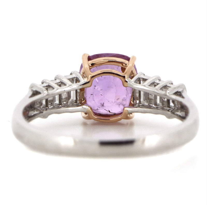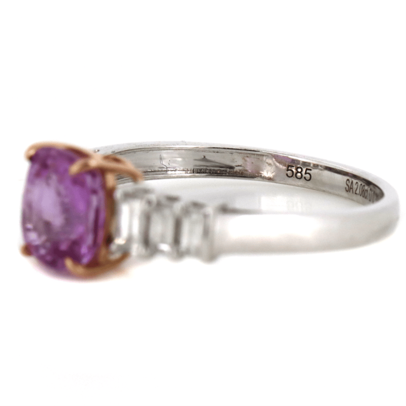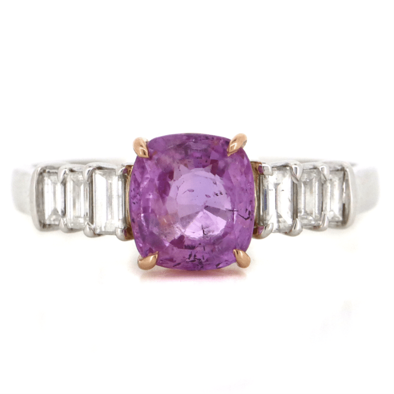 14K WHITE/ROSE GOLD, PINK SAPPHIRE AND DIAMOND, DRESS RING. THE CENTRE FEATURES, ONE CUSHION CUT, BRIGHT PINK SAPPHIRE (2.08CT, LIGHT NATURAL INCLUSIONS), 4 CLAW SET. ENCOMPASSING THE CENTRE AND DECORATING THE BAND ARE, 6 BAGUETTE CUT, DIAMONDS (0.33CT TDW, G-H COLOUR, SI-I1 CLARITY), CLAW SET. RING SIZE N.