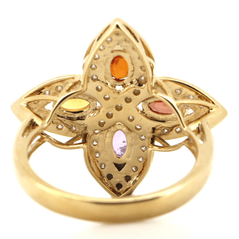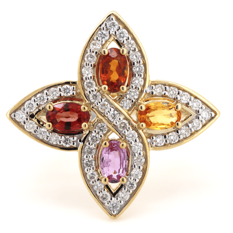 14K YELLOW GOLD, MULTI-COLOURED SAPPHIRE AND DIAMOND, DRESS RING. THE DESIGN FEATURES 4 OVAL FACETED MULTI COLOURED SAPPHIRES (1.20 TSW, PINK, YELLOW, ORANGE, RED COLOUR, EYE CLEAN CLARITY). FOUR CLAW SET. SURROUNDING THE COLOURED STONES IN A FANCY SWIRL DESIGN ARE 49 ROUND BRILLIANT CUT DIAMONDS (0.46CT TDW, G-I COLOUR, SI CLARITY) BEAD SET. RING SIZE Q.