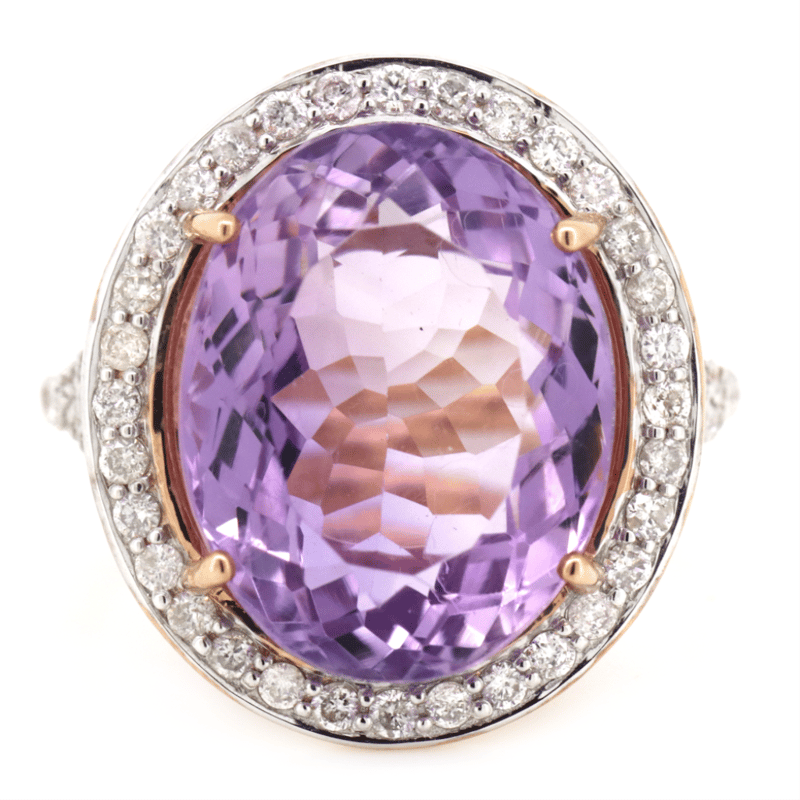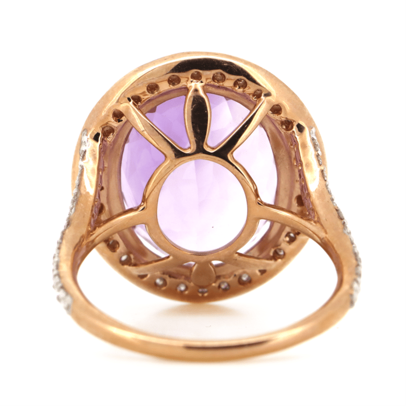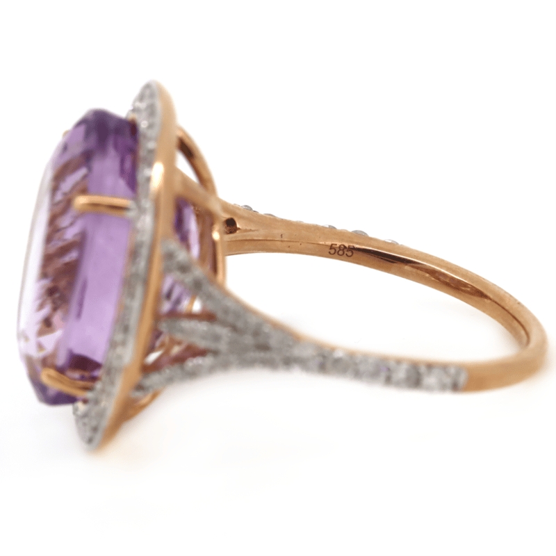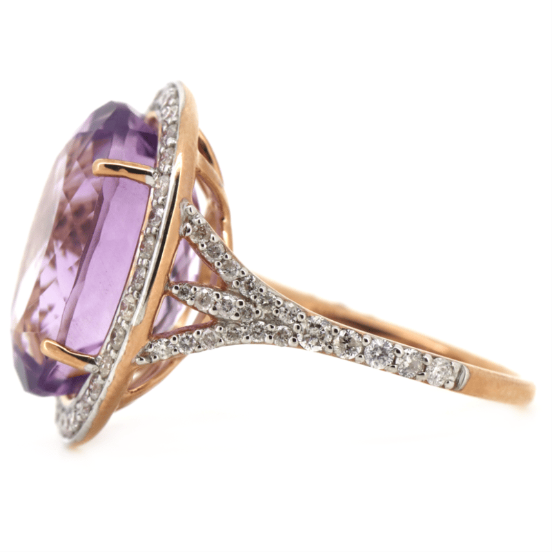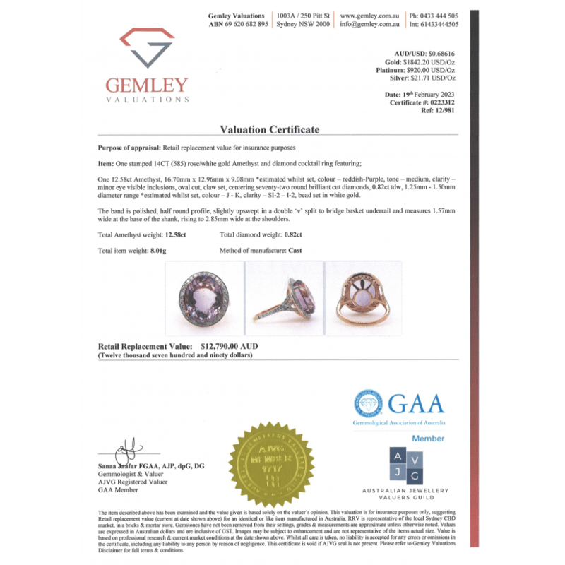 14K ROSE GOLD, 12.58CT AMETHYST AND DIAMOND, COCKTAIL RING. THE CENTRE FEATURES, ONE OVAL CUT, MEDIUM REDDISH-PURPLE, AMETHYST (12.58CT, MINOR EYE VISIBLE INCLUSIONS), CLAW SET. SURROUNDING THE CENTRE IN A HALO AND DECORATING THE SPLIT BAND ARE, 72 ROUND BRILLIANT CUT, DIAMONDS (0.82CT TDW, J-K COLOUR, SI2-I2 CLARITY), BEAD SET IN WHITE GOLD. RING SIZE M. Valuations Provided by an Independent Third-Party Professional Not Directly Associated With Lloyds Auctions at AUD $12,790.00This valuation has been conducted by an independent third-party professional. The valuation amount is an assessment by the issuing valuer and does not reflect the auction value of the item. Any inquiries regarding the valuation should be directed to the issuing valuer (refer to contact details on the certificate), as Lloyds Auctions has no affiliation or influence over the valuation, the valuer, or the stated amount. Condition: Good - Refer Images 0645880+242