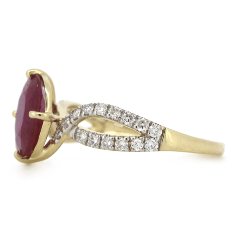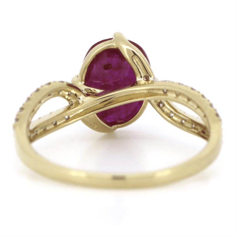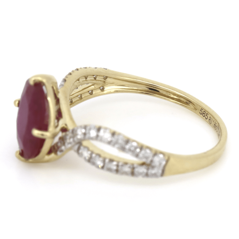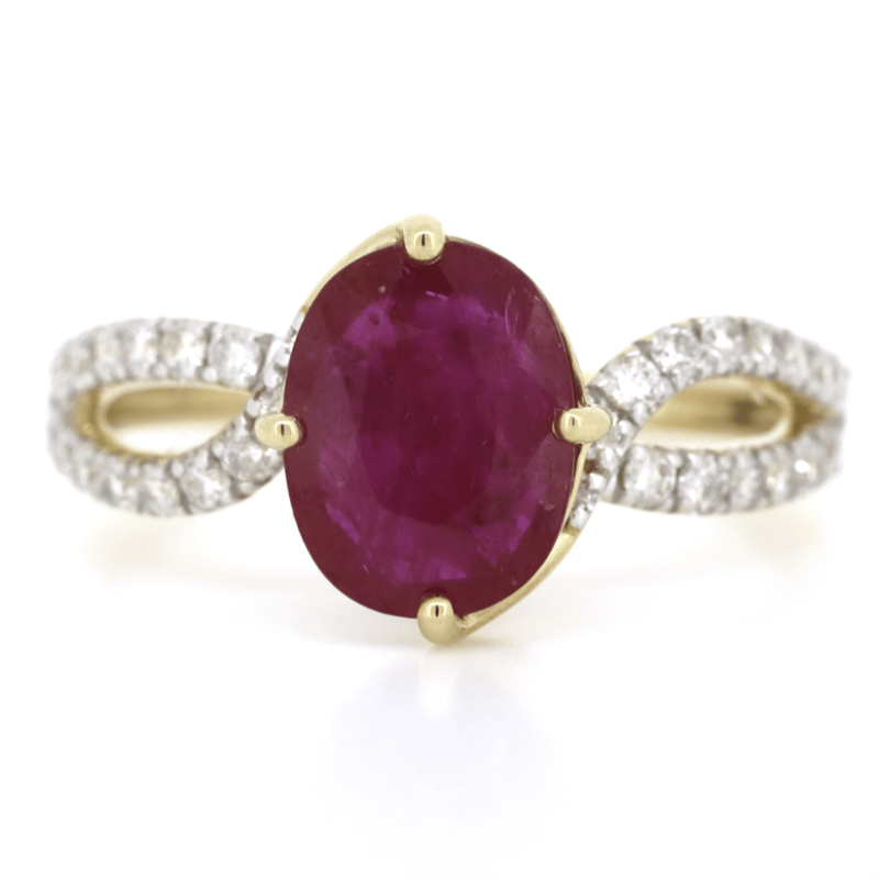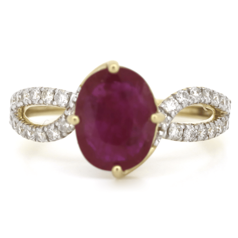 14K YELLOW GOLD, RUBY AND DIAMOND, SPLIT BAND RING. THE DESIGN FEATURES, ONE OVAL CUT, MID-DARK RED, RUBY (1.85CT, MODERATE-HEAVY INCLUSIONS), 4 CLAW SET. DECORATING THE SPLIT BAND ARE, 30 ROUND BRILLIANT CUT, DIAMONDS (0.38CT TDW, G-H COLOUR, SI-I1 CLARITY), MICRO-CLAW SET IN YELLOW GOLD. RING SIZE N.