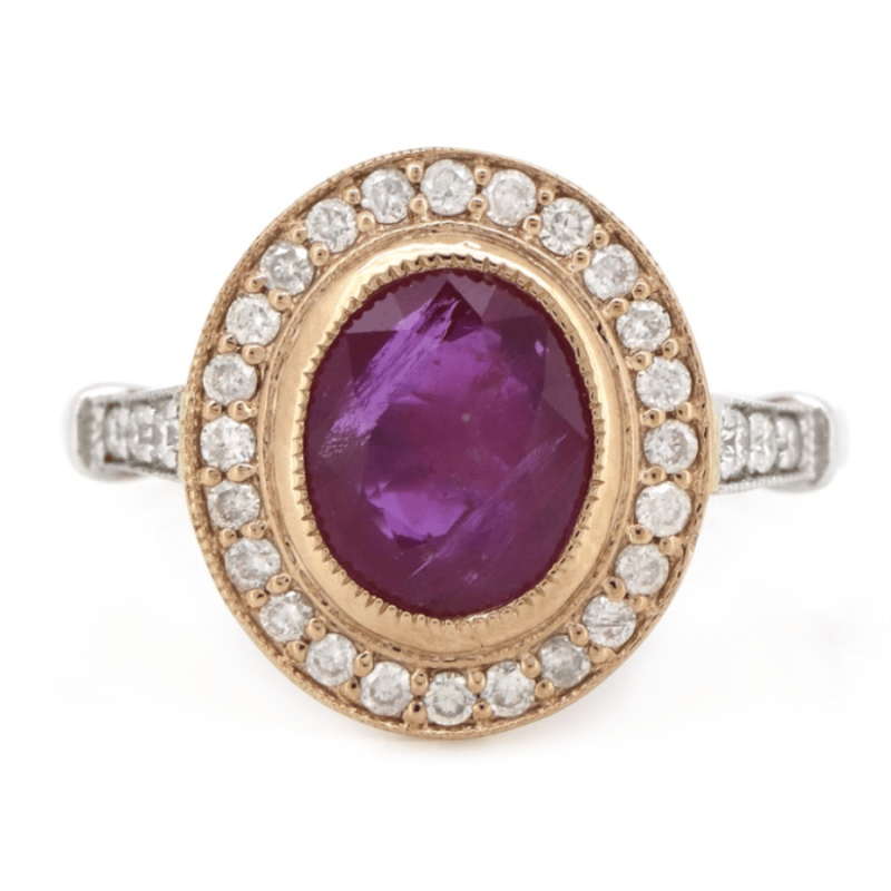 14K ROSE/WHITE GOLD, RUBY AND DIAMOND, HALO RING. THE CENTRE FEATURES, ONE OVAL CUT, PURPLISH-RED, RUBY (1.85CT, MODERATE EYE VISIBLE INCLUSIONS), BEZEL SET IN ROSE GOLD. SURROUNDING THE CENTRE ARE, 30 ROUND BRILLIANT CUT, DIAMONDS (0.37CT TDW, J-K COLOUR, SI2-I2 CLARITY), BEAD SET WITH MILLEGRAIN DETAIL. RING SIZE O. Valuations Provided by an Independent Third-Party Professional Not Directly Associated With Lloyds Auctions at AUD $9,490.00This valuation has been conducted by an independent third-party professional. The valuation amount is an assessment by the issuing valuer and does not reflect the auction value of the item. Any inquiries regarding the valuation should be directed to the issuing valuer (refer to contact details on the certificate), as Lloyds Auctions has no affiliation or influence over the valuation, the valuer, or the stated amount. Condition: Good - Refer Images 0645880+228