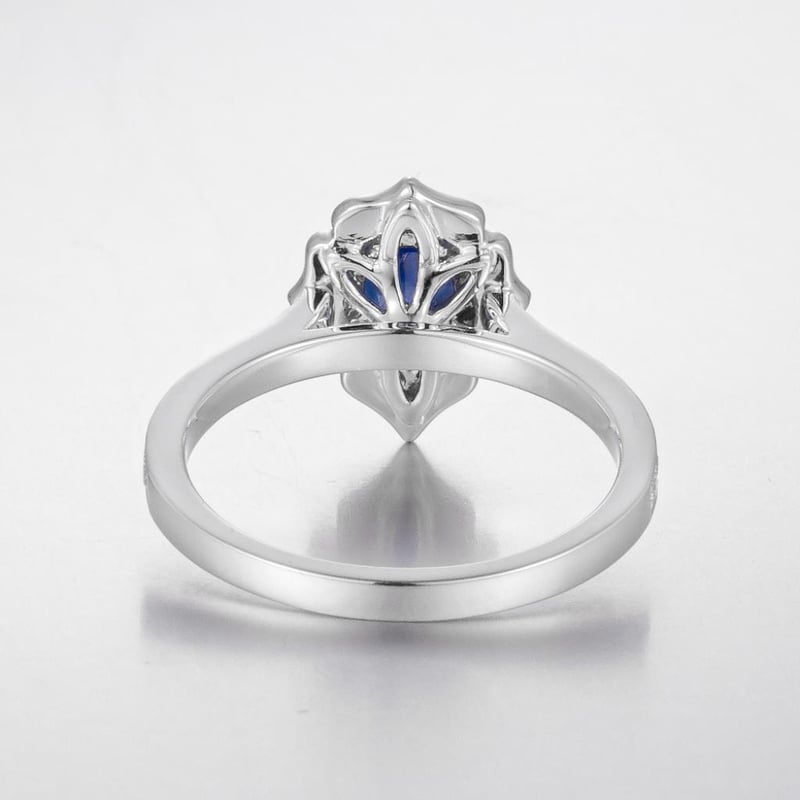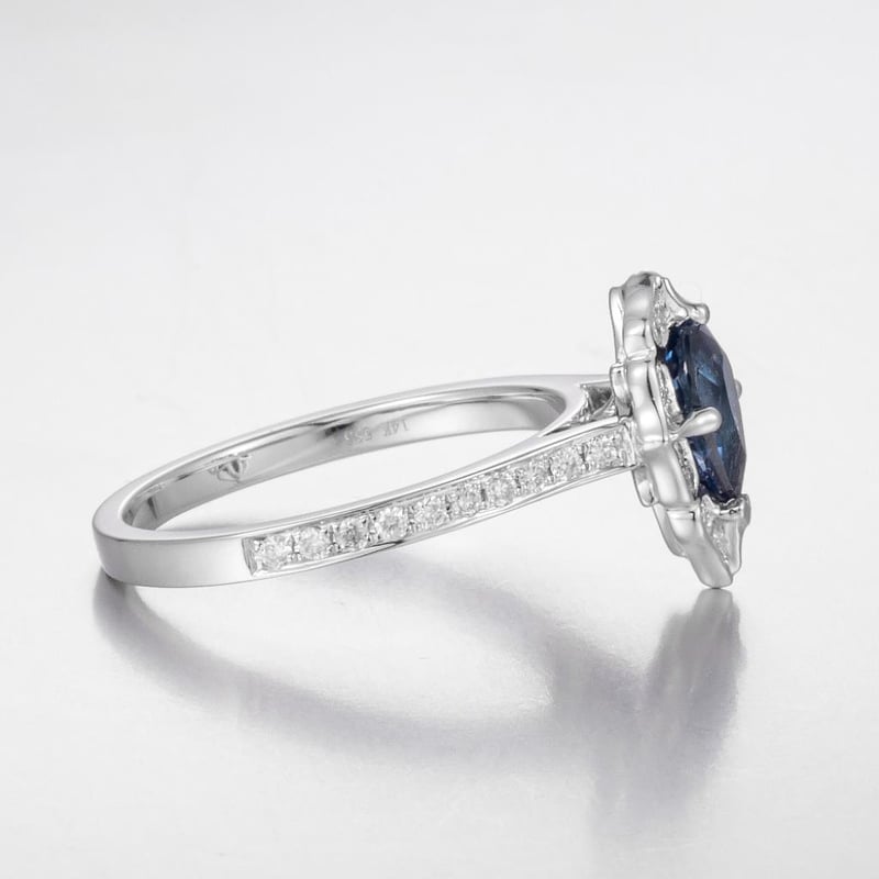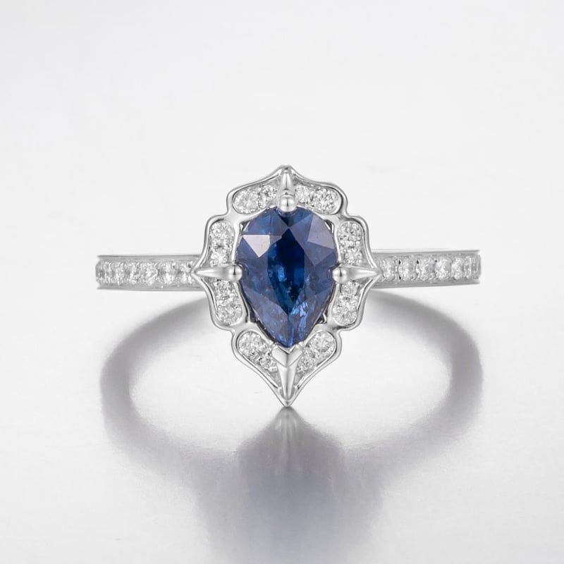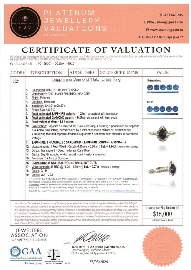 14CT WHITE GOLD AUSTRALIAN SAPPHIRE AND DIAMOND HALO RING 14Ct White Gold Australian Sapphire And Diamond Halo Ring Featuring Centre, One Pear Cut, Deep Moderate Royal Blue Australian Sapphire (1.24Ct, Slightly Included), Claw Set, With 36 Round Brilliant Cut Diamonds (0.27Ct Tdw, G-H Colour, Vs1-Vs2 Clarity), Micro-Bead Set. Ring Size O. Jewellery Valuations Provided By A Third Party Professional Not Directly Associated With Lloyds Auctions at AUD $18000This Insurance Valuation has been provided by a registered Jewellery Valuer and is intended for insurance purposes only. The valuation amount has no bearing on the auction value of the item. Any questions regarding the valuation should be directed to the issuing Valuer (refer to contact details on the certificate) as Lloyds have no association or relationship with the Valuer or the valuation amount contained within the valuation. 0586247+1450