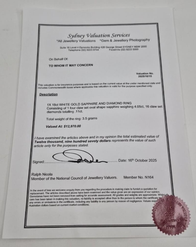 This valuation has been conducted by an independent third-party professional. The valuation amount is an assessment by the issuing valuer and does not reflect the auction value of the item.
