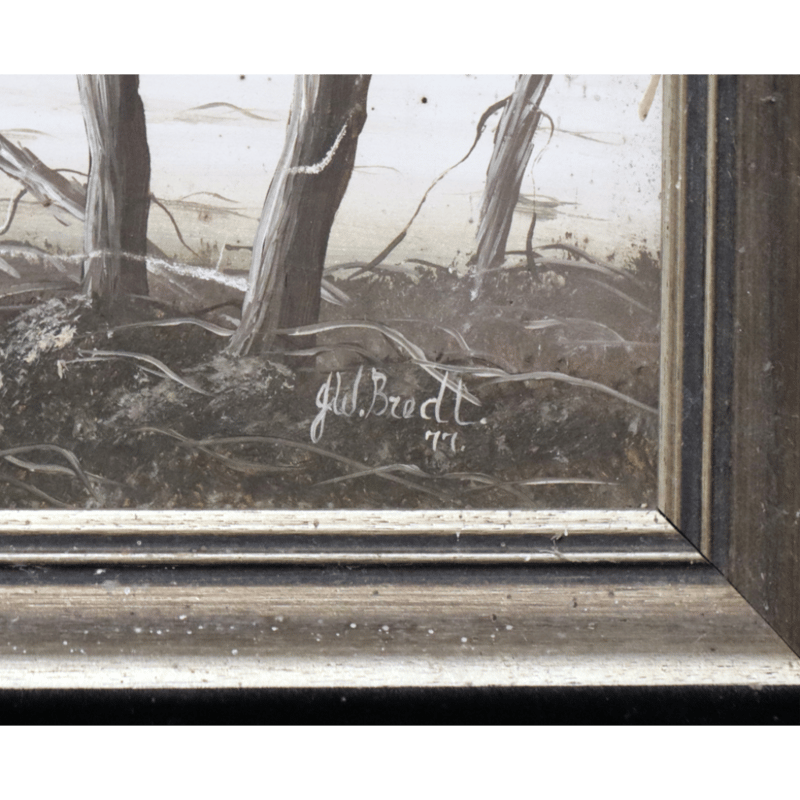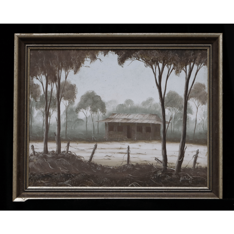ORIGINAL ACRYLIC ON BOARD, COTTAGE IN BUSHLAND LANDSCAPE, BY JOHN W BREDL 1977, WOODEN FRAME.