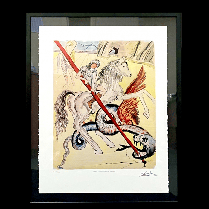 SALVADOR DALI (1904-1986) "SAINT GEORGE AND THE DRAGON" DECORATIVE GICLEE AFTER THE ORIGINAL, FASCIMILE SIGNATURE. ARTWORK IS FRAMED AND READY TO HANG. IMAGE: 75CM X 58CM, FRAME: 88CM X 71CM. CONDITION: PRE-OWNED. Condition: PRE-OWNED 645933+9202