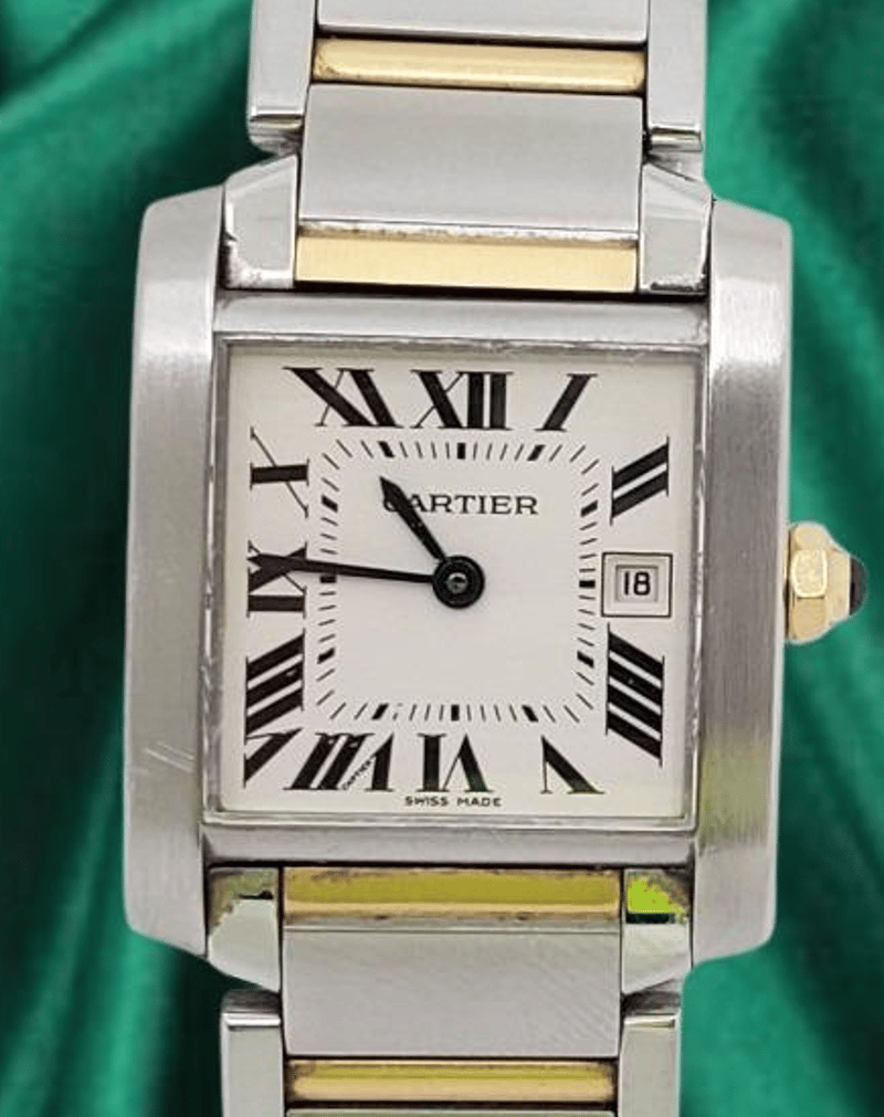 CARTIER TANK FRANCAISE W51005Q4 Price Guide - $7,500 - $8,000 REFERENCE NO. W51005Q4 DIAL: SILVERED FLINQUE CASE DESCRIPTION: STEEL CASE SIZE: 36.5 X 28.15 BRACELET: TWO TONE BRACELET, STEEL MOVEMENT: AUTOMATIC BOX: INCLUDED PAPERS: INCLUDED Condition: Good - Refer To Images Additional Information: Accompanied By Service Documents FC 162964+2