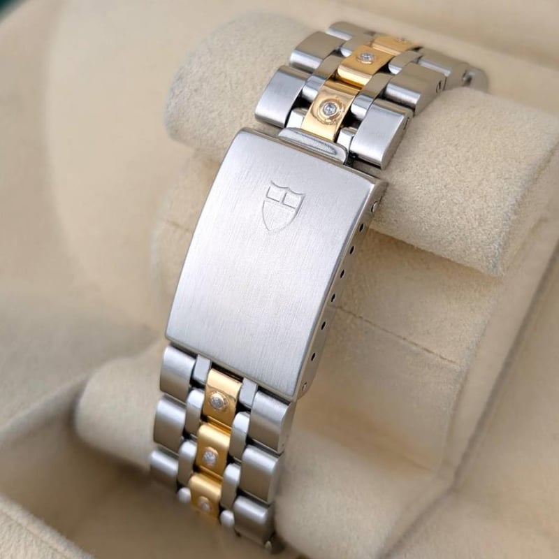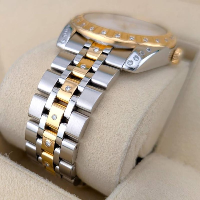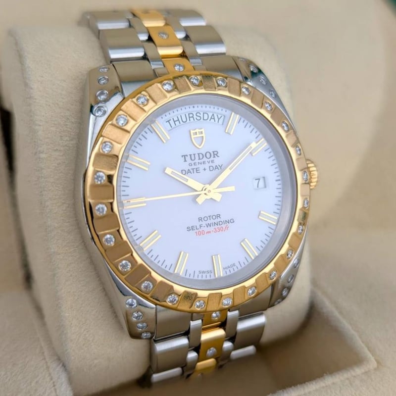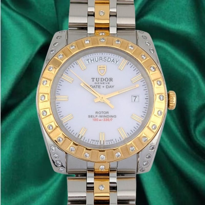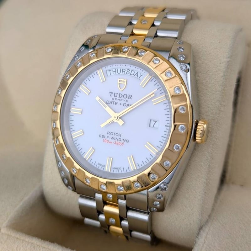 Model: Classic Date+Day – 18K Yellow Gold Two Tone, White Dial, Custom Diamond Studded Bezel & Bracelet
