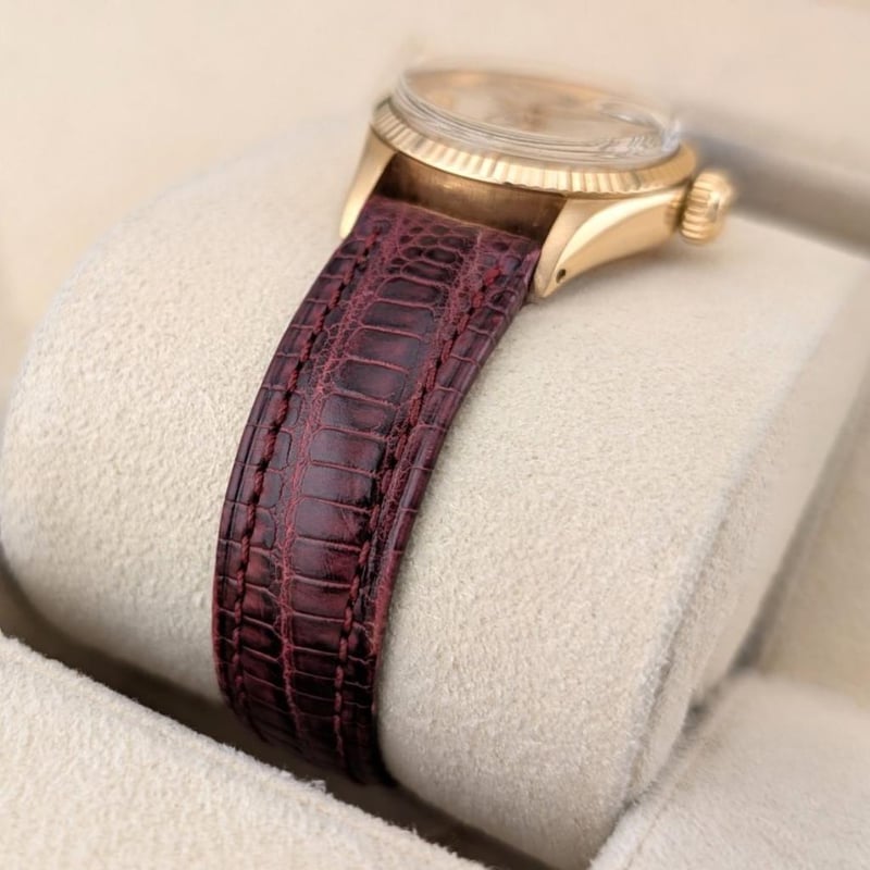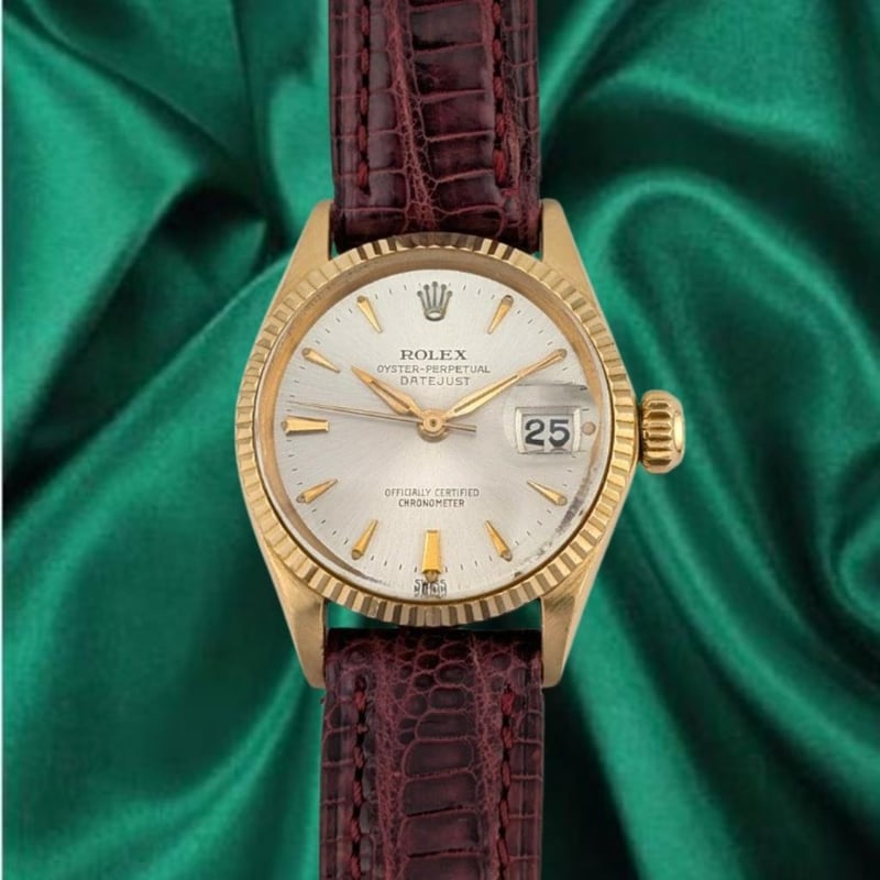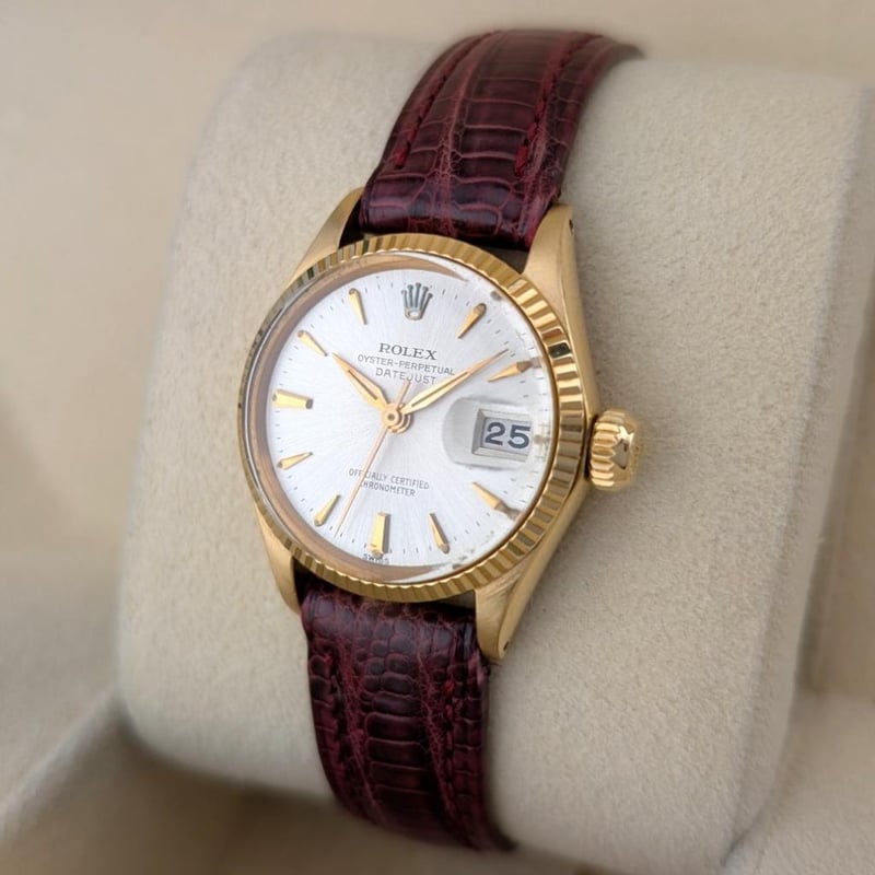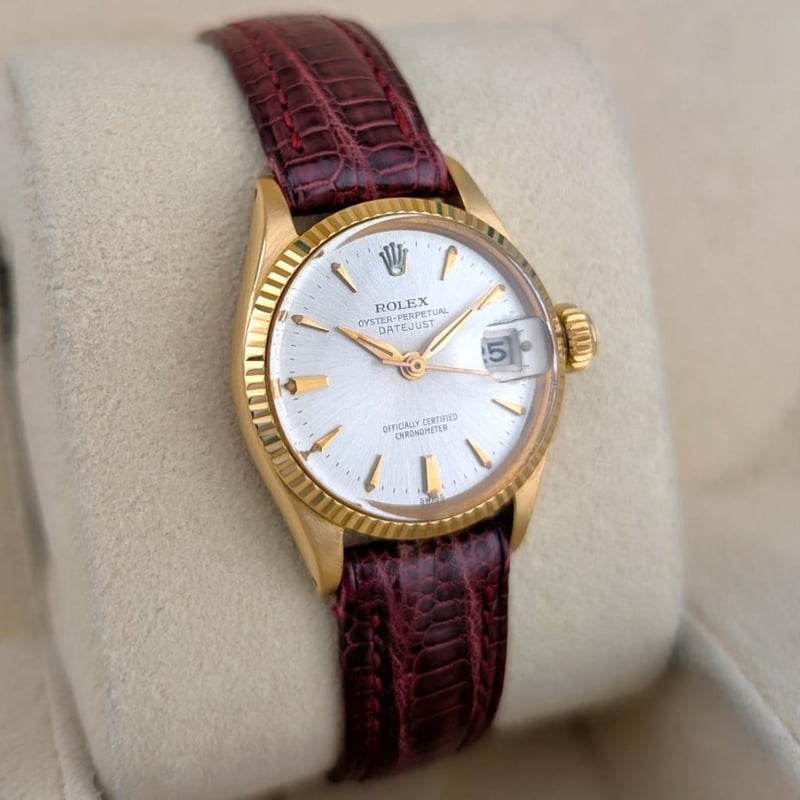 ROLEX 6517 OYSTER PERPETUAL LADY DATE 18K 25MM 1963 Brand: RolexReference: 6517Model: Oyster Perpetual Lady Date – 18K Yellow Gold, Sunburst Silver Dial, Burgundy Alligator StrapCase Size: 25MmCirca: 1963Movement: AutomaticCondition: Good VintageBox: NoPapers: No Condition: Good - Refer Images 0488340+11