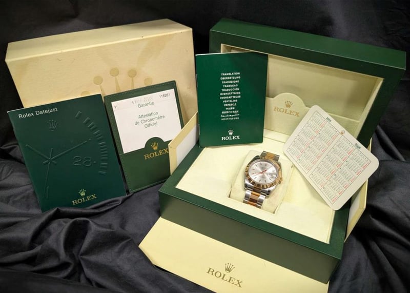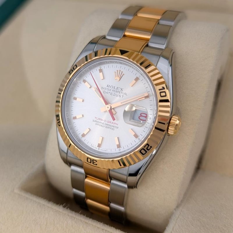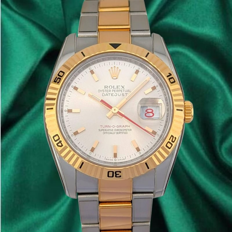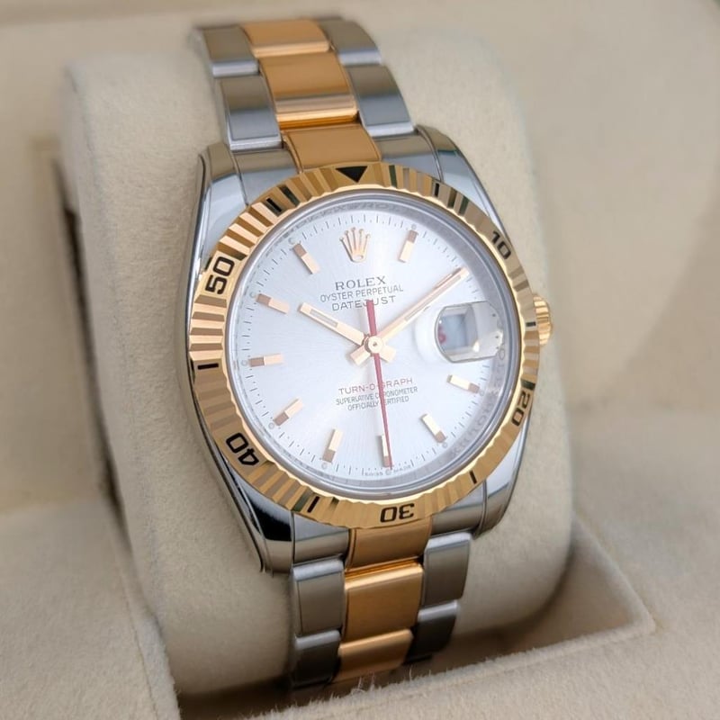ROLEX 116261 DATEJUST TURN-O-GRAPH WHITE 36MM 2005 BOX & PAPERS Brand: RolexReference: 116261Model: Datejust Turn-O-Graph – Everose Gold Two Tone, Sunburst White DialCase Size: 36MmCirca: 2005Movement: AutomaticCondition: Very Good; Full Rx-8 StickersBox: YesPapers: Yes Condition: Good - Refer Images 0488340+7
