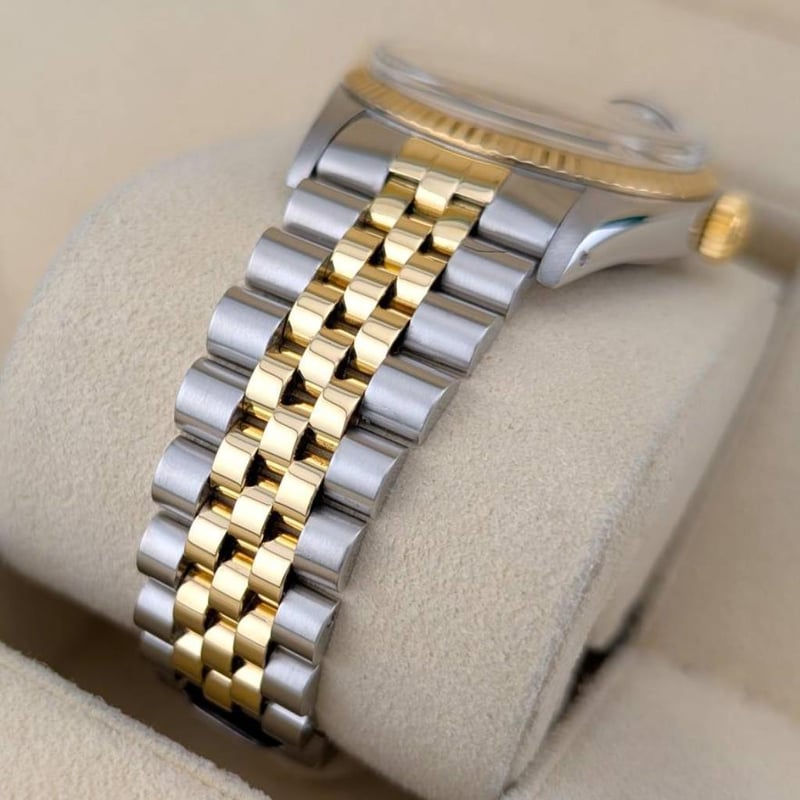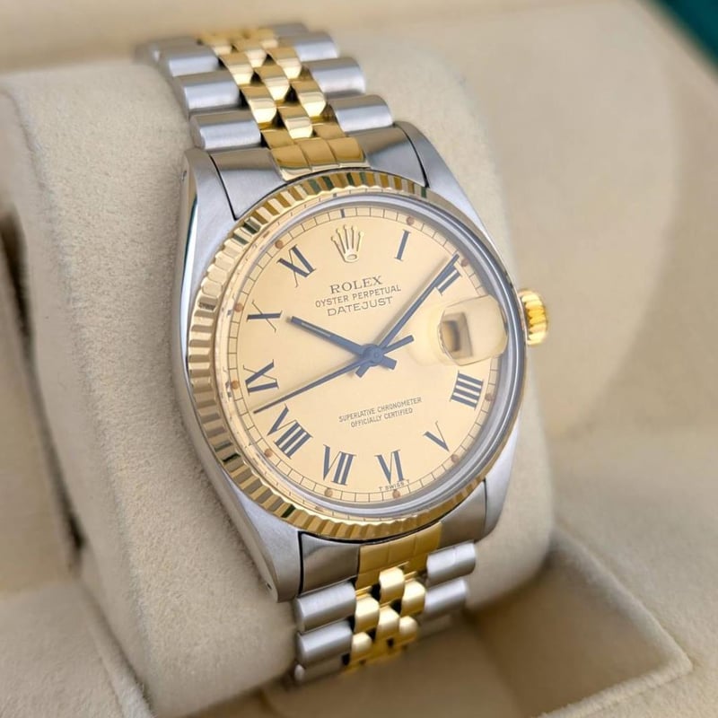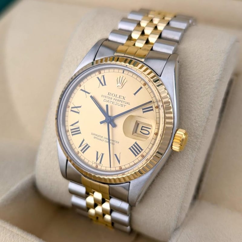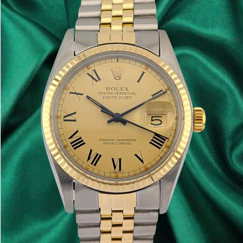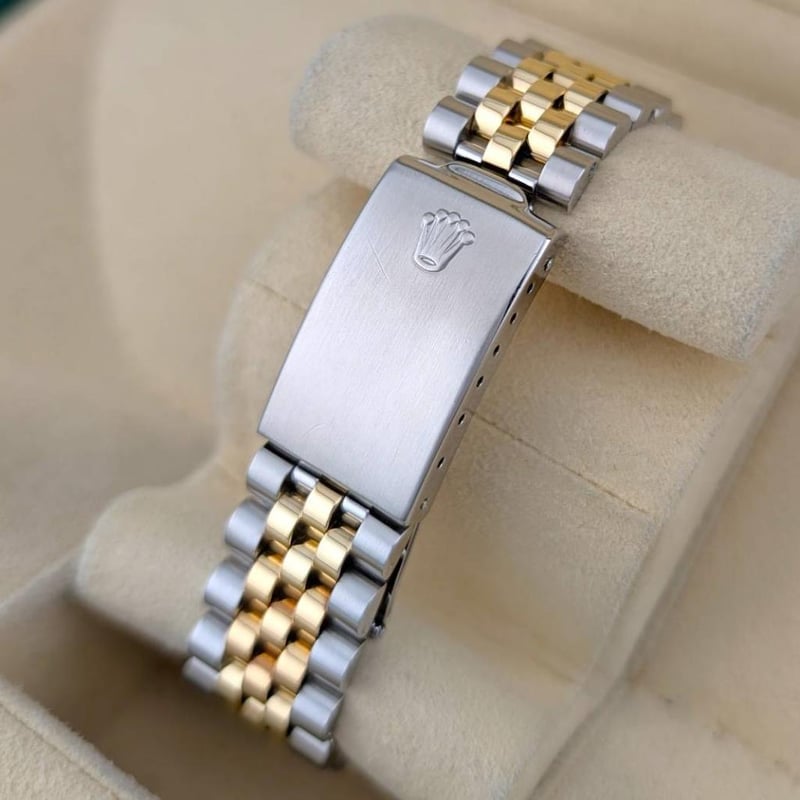 ROLEX 16013 DATEJUST GOLD BUCKLEY DIAL ON JUBILEE 36MM 1978 Brand: RolexReference: 16013Model: Datejust 36 – Two Tone Jubilee, Gold ‘Buckley’ Roman DialCase Size: 36MmCirca: 1978Movement: AutomaticCondition: Good Vintage, Freshly Serviced; Some Damage On Two LinksBox: NoPapers: No Condition: Good - Refer Images 0488340+12