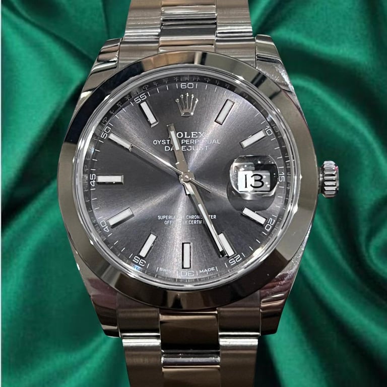 ROLEX DATEJUST 41 126300 SLATE DIAL OYSTERSTEEL SMOOTH BEZEL BXP & COA Price Guide - $15,000 - $17,000 Brand: Rolex Model Number: DATEJUST Reference Number: 126300 Production Year: 2019 Dial: BLACK Case: STAINLESS STEEL Case Size: 43MM Bracelet: RUBBER Movement: AUTOMATIC Box: Yes Papers: Yes