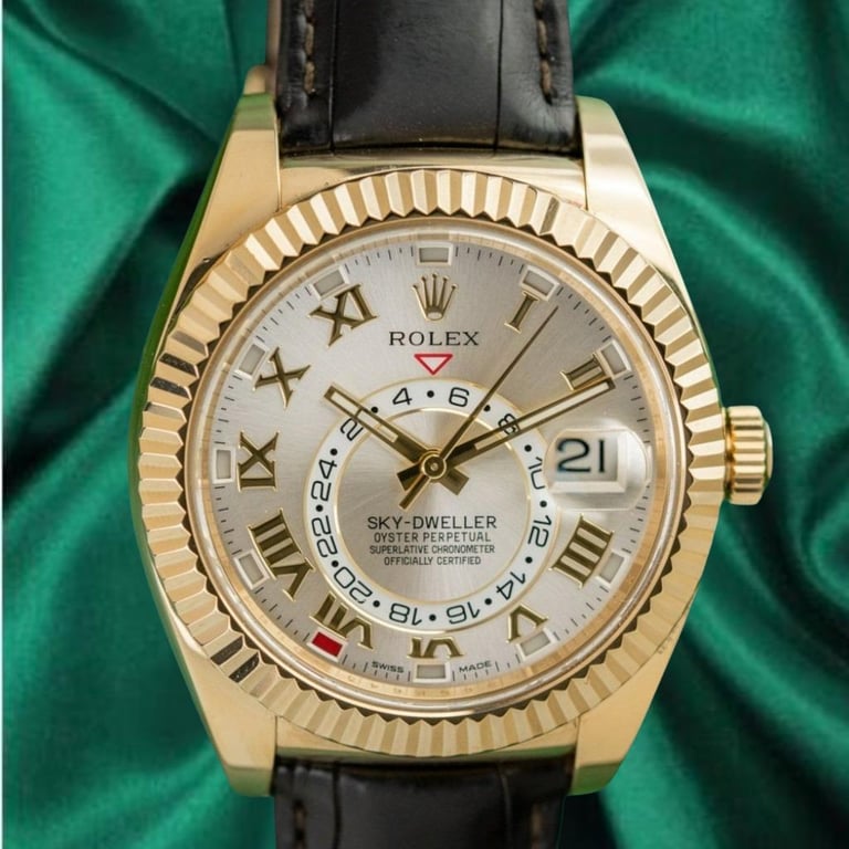 ROLEX SKY-DWELLER 326138 18K YELLOW GOLD SILVER DIAL LEATHER STRAP 2014