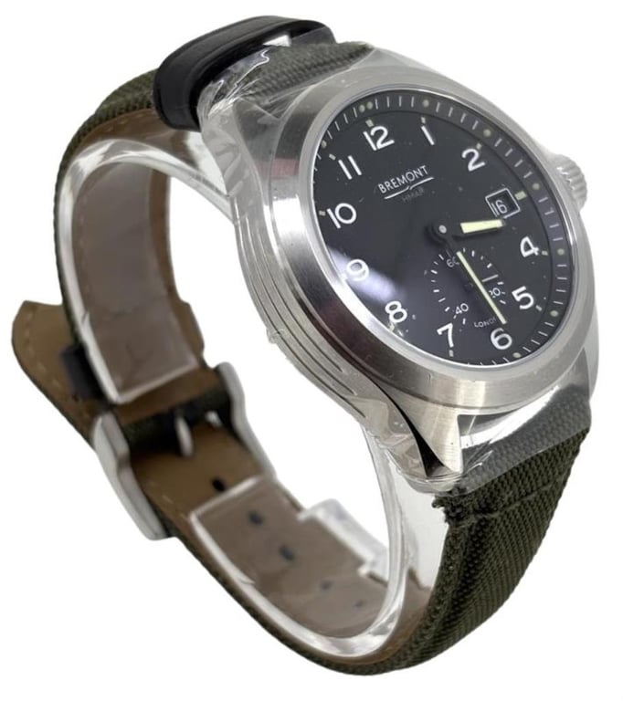 BREMONT BP BROADSWORD 2023 Price Guide - Circa $3,500 PRODUCTION YEAR: 2023 DIAL: BLACK CASE DESCRIPTION: STAINLESS STEEL CASE SIZE: 40MM BRACELET: KHAKI GREEN SAILCLOTH MOVEMENT: AUTOMATIC BOX: No Box Included PAPERS: No Papers Included Condition: Used - Refer Images Additional Information: Serial# 275*** SR