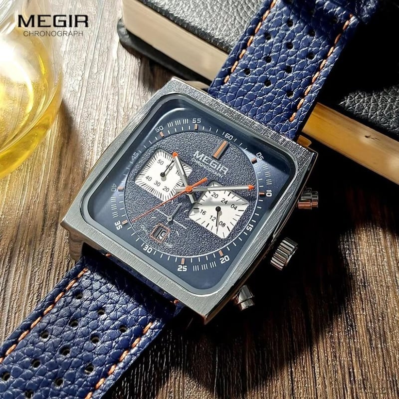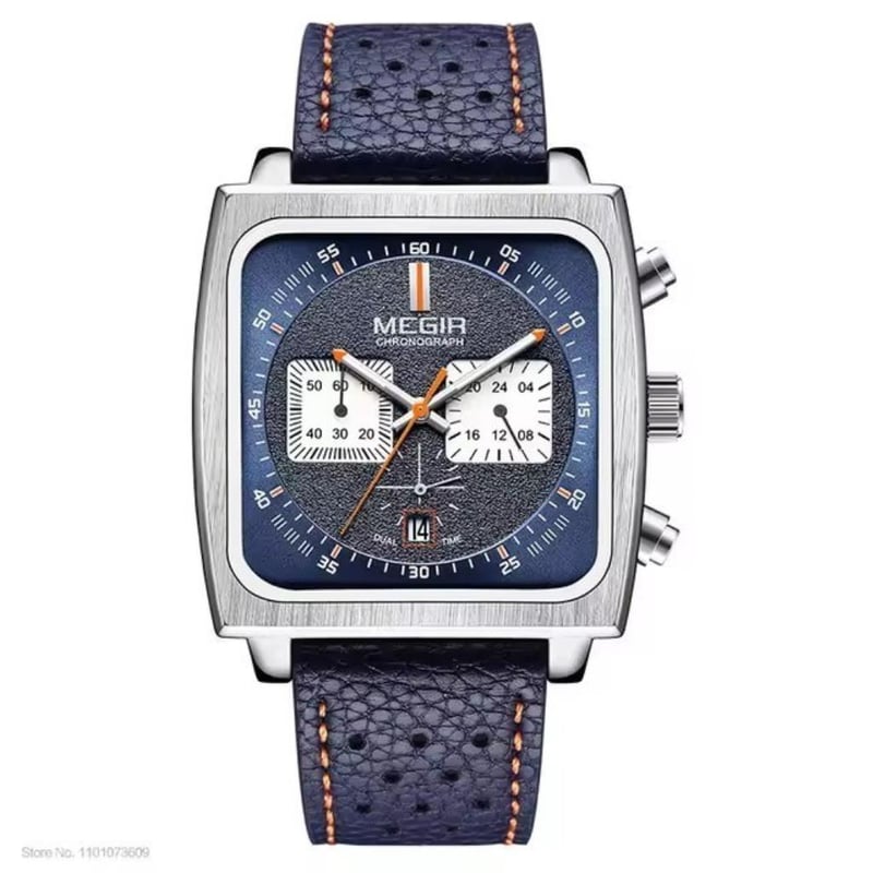 MEGIR BLUE SQUARE SS CHRONO Model: Ml2182Gbe-2 - Blue Features: Auto Date, Luminous Hands, Complete Calandar, Chronograph, Water Resistant Depth 3Bar Dial: Blue With White Luminous Hands & Markers, 43.5Mm Diameter, Hardlex Mineral Crystal Glass Movement: Quartz Water Resistance: 3Bar -Depth 3Atm Case: Square Shape, 11.0Mm Thickness Band: Blue Leather Band With Buckle. Width: 24Mm, Length: 260Mm Boxed: Boxed //Nl15// Condition: Good - Refer Images 0 1611191+2