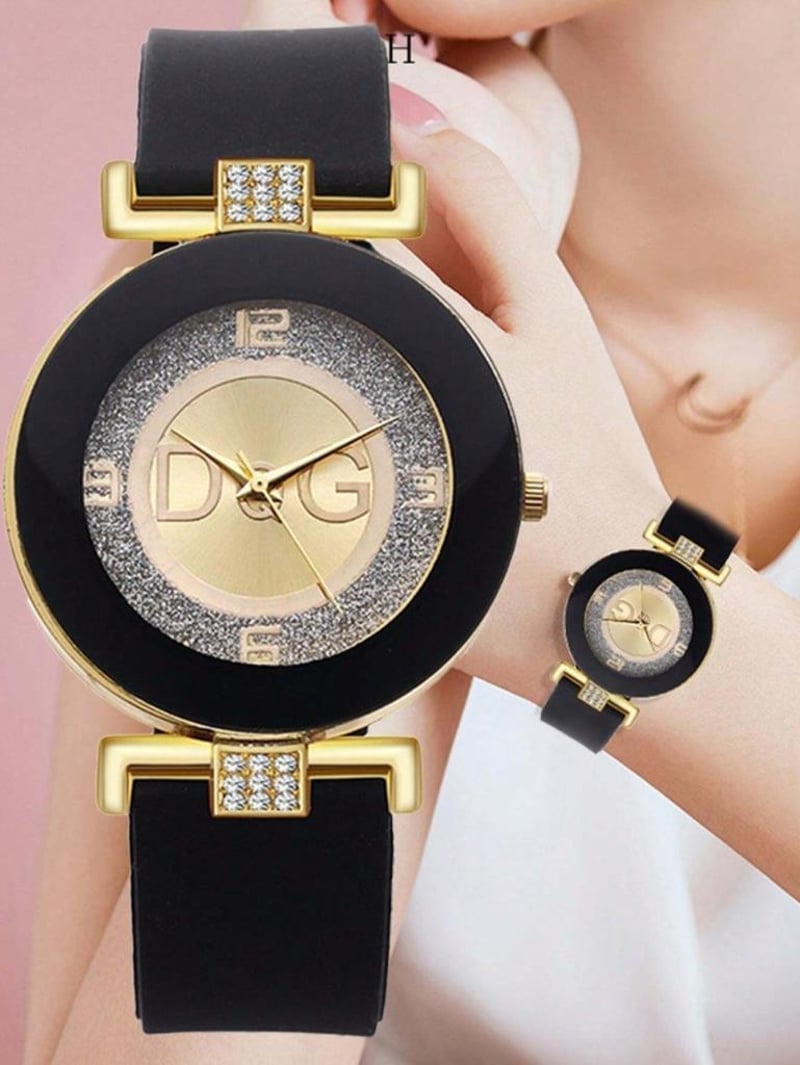 DQG STUNNING LADIES 3 TONE QUARTZ WRISTWATCH Dqg Stunning Ladies 3 Tone Quartz WristwatchModel: Black Silver & GoldStyle: Ladies Dress Watch Dial: Gold Silver Color With Black Shiny Outer Rim Movement: QuartzWaterproof: No Band: Black Silicone With BuckleBoxed: No Box **Note The Brand Is Dqg Not D&G**//Nn59// Condition: Good - Refer Images 01611191+6