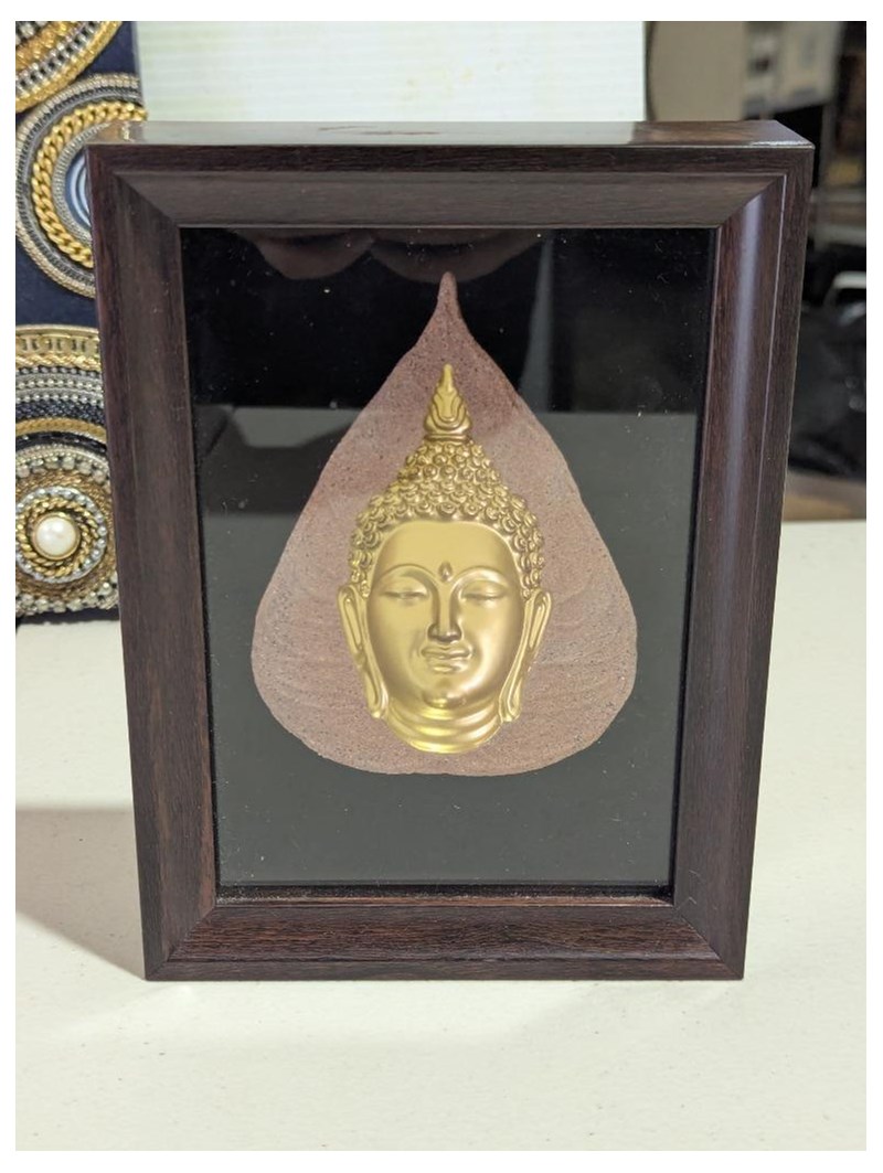 2 x Hand made Contempory wall art with beaded jewels & Chains on wood , 1 x contempory Peacock jewelled Show Box art, No frame, 1 x Gold Buddha Head in frame, 1 x gold frame measures 36 x 26.5cm