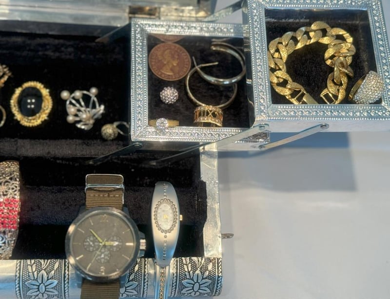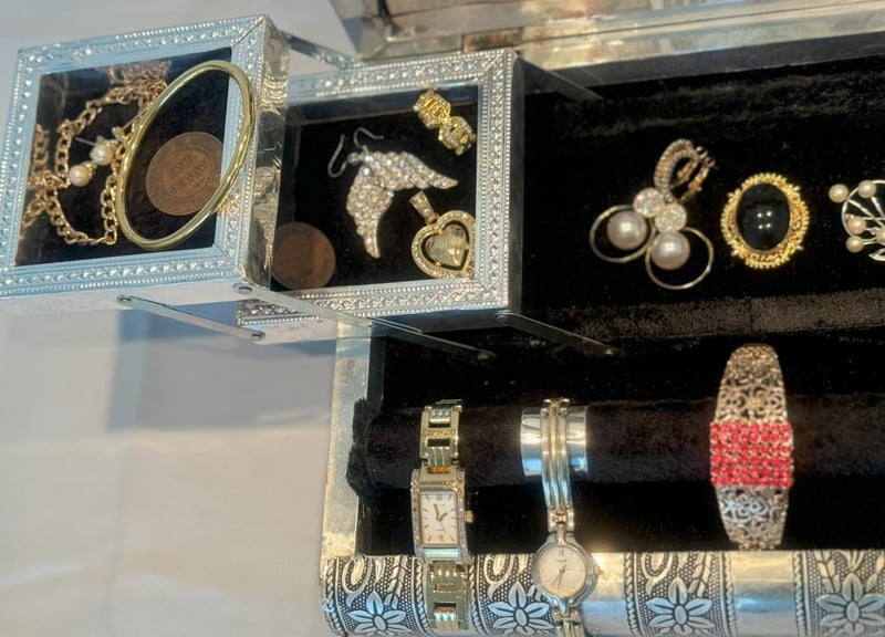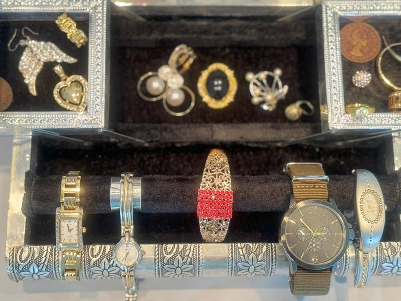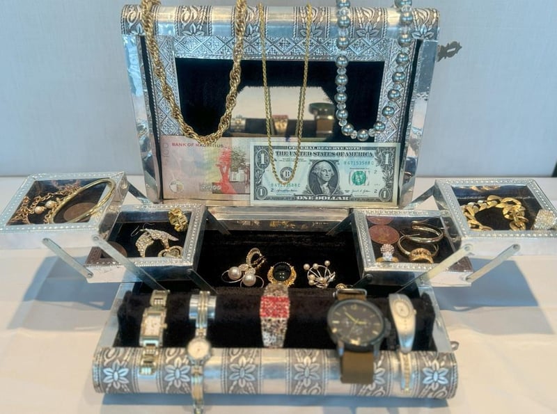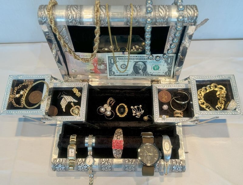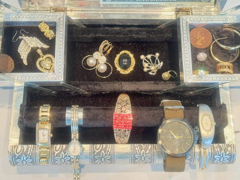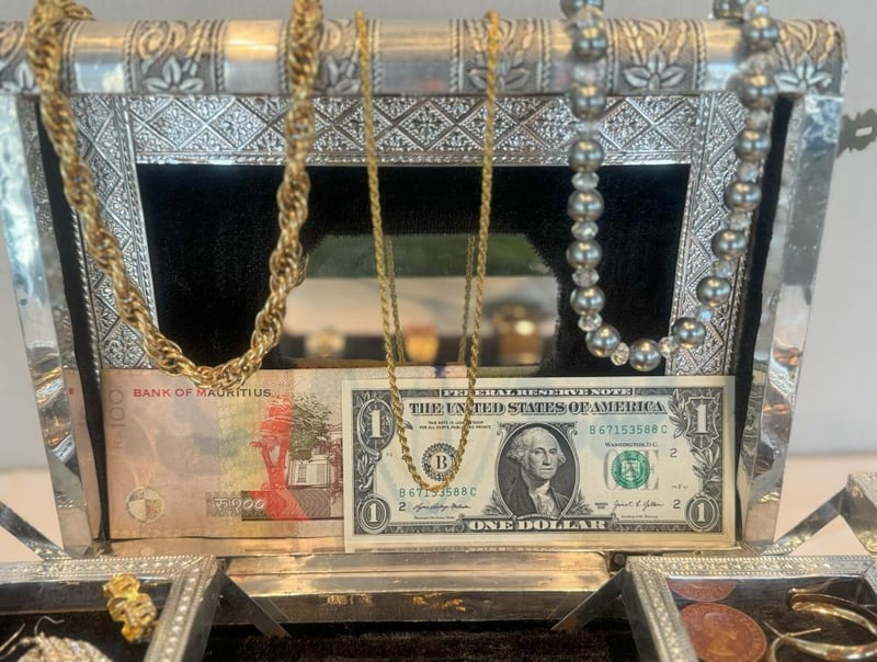 JEWELLERY BOX WITH COLLECTABLE BANKNOTES, COINS & ASSORTED JEWELLERY.Condition: Good - Refer To Images586171+13