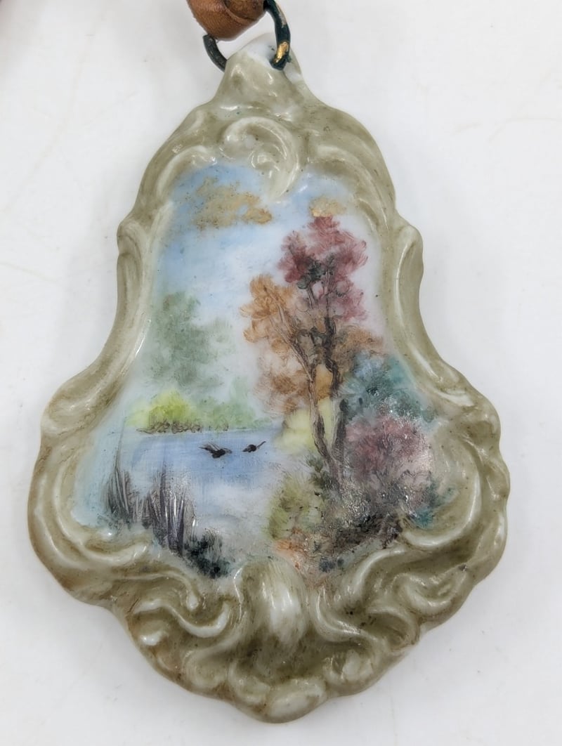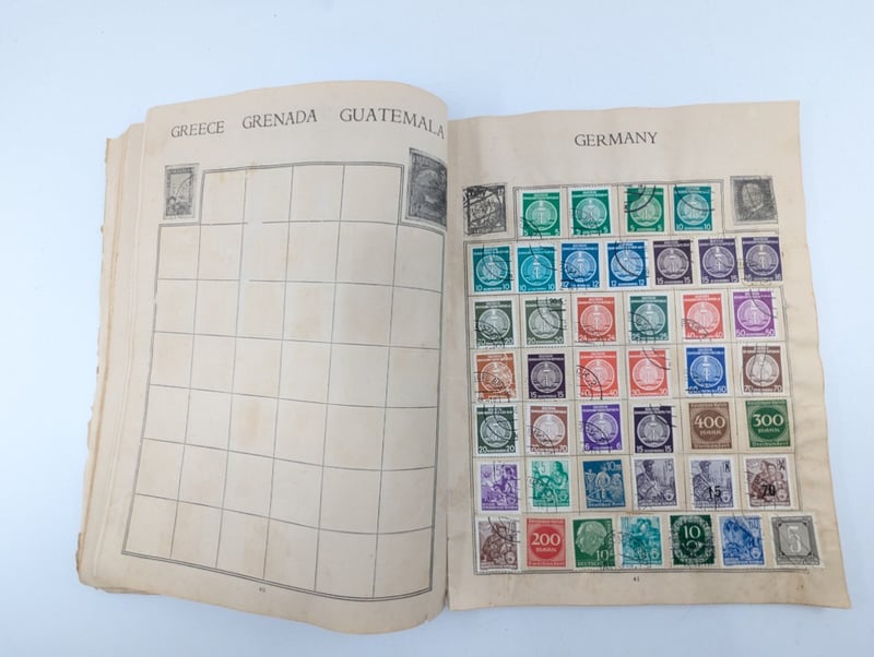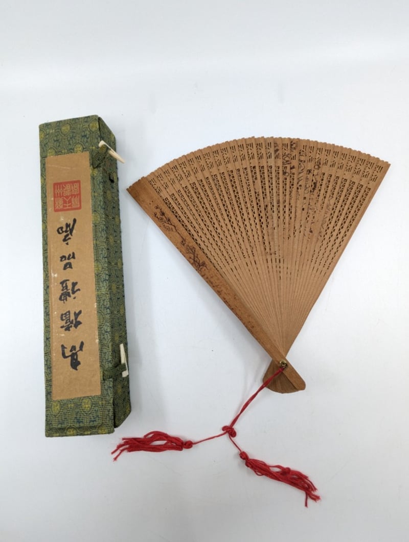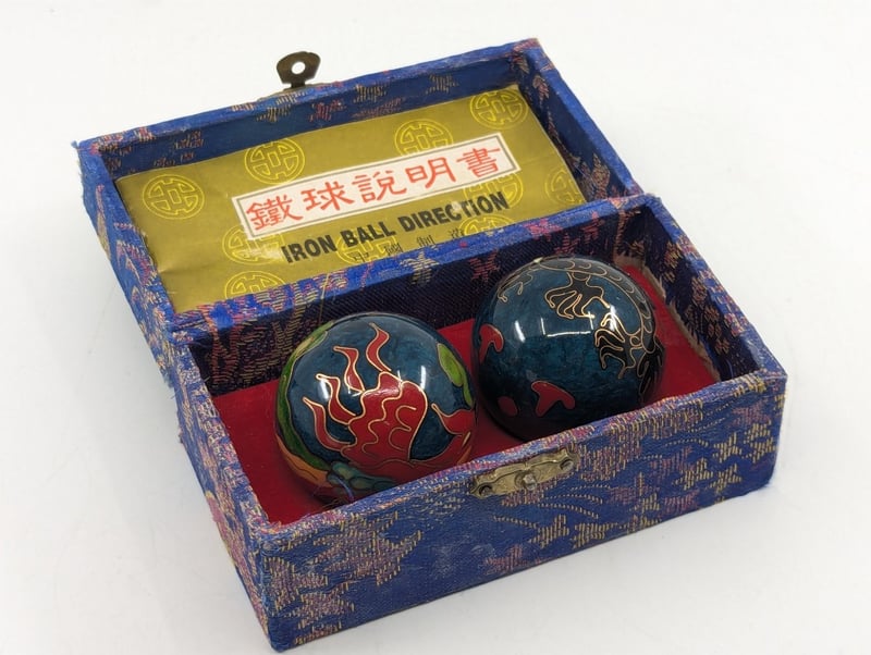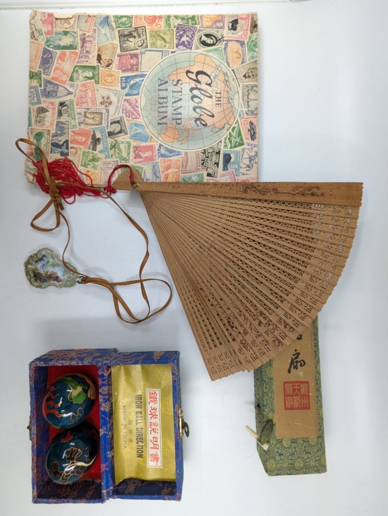 COLLECTABLES, INCLUDING STAMP ALBUM, ORIENTAL HAND FAN, HAND PAINTED PENDANT AND BAODING BALLS
