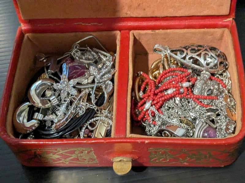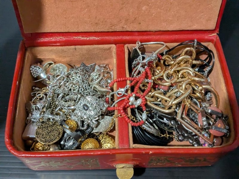 ASSORTED COSTUME JEWELLERY IN RED JEWELLERY BOX