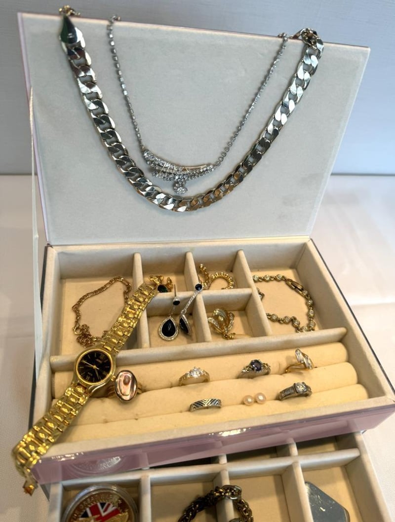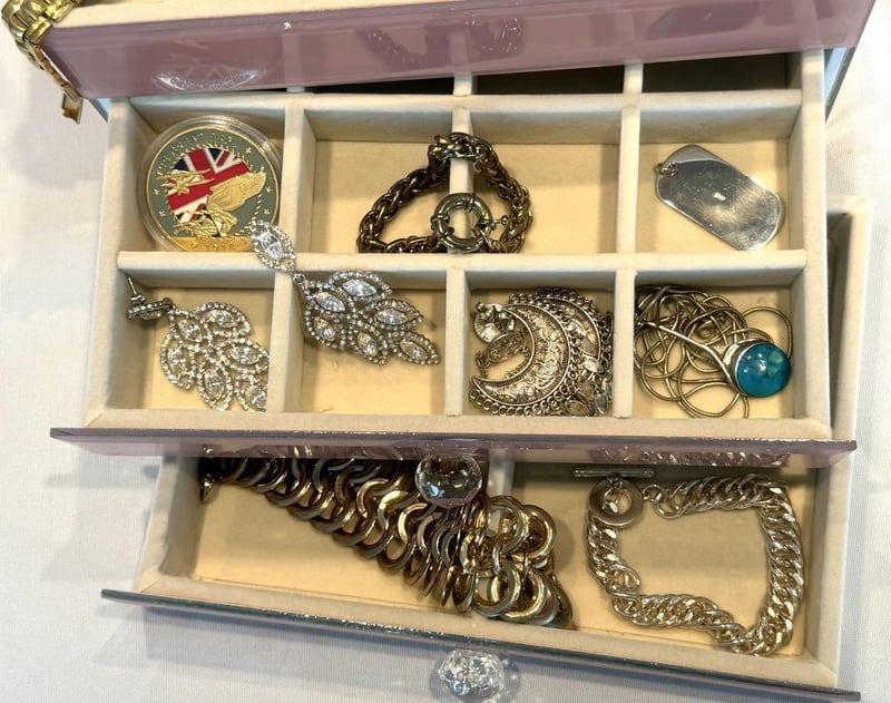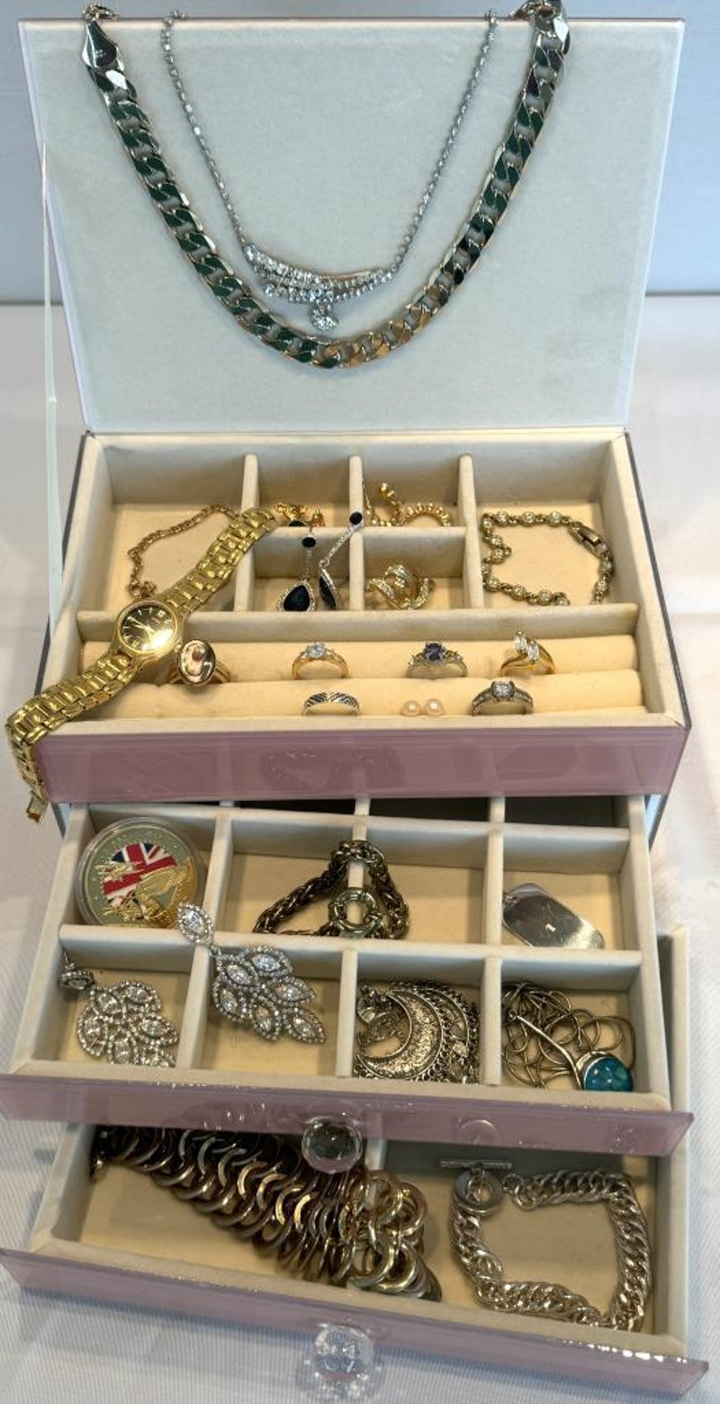 JEWELLERY BOX WITH ASSORTED JEWELLERY & COLLECTABLE COIN ALSO INCLUDES SOME VINTAGE, STERLING SILVER, NATURAL PEARLS, BROOCHES, & MORE.