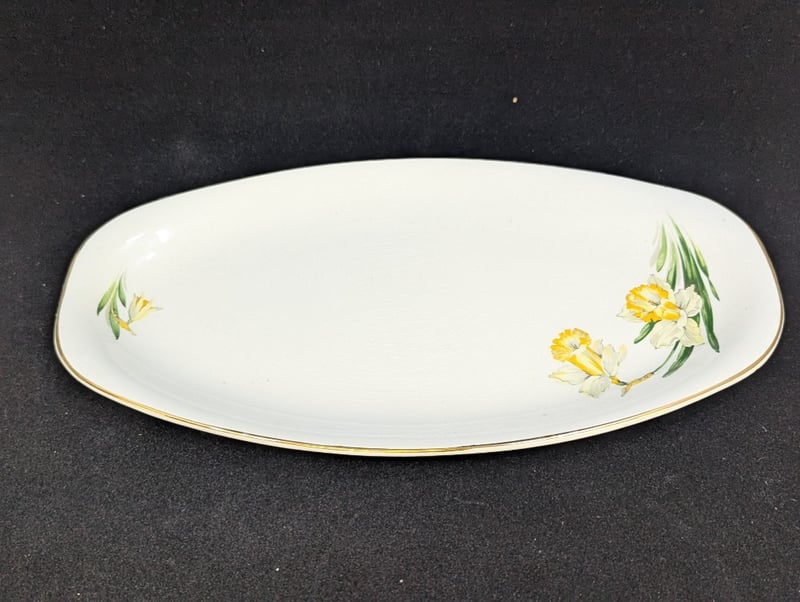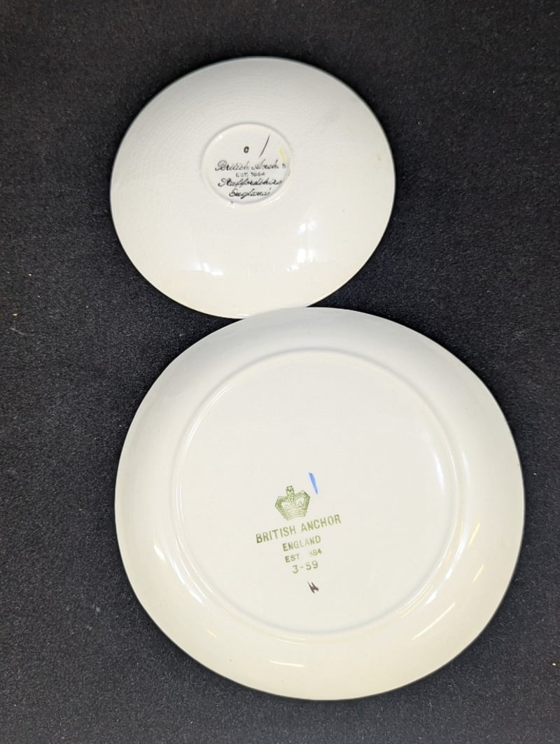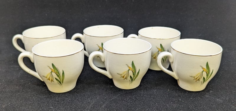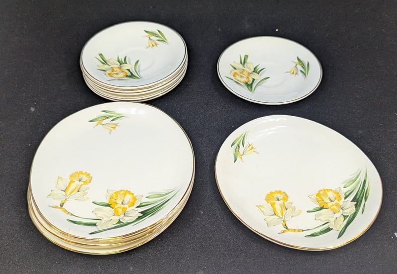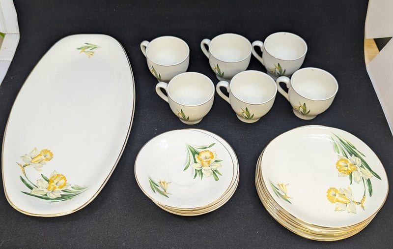 BRITISH ANCHOR COFFEE SET PLUS SERVING PLATTER AND PLATES. CONSISTS OF 6 DEMITASSE DUOS, 1 PLATTER AND 6 SERVING PLATES FEATURING DAFFODIL PATTERN.Condition: Good - Refer To Images584897+3