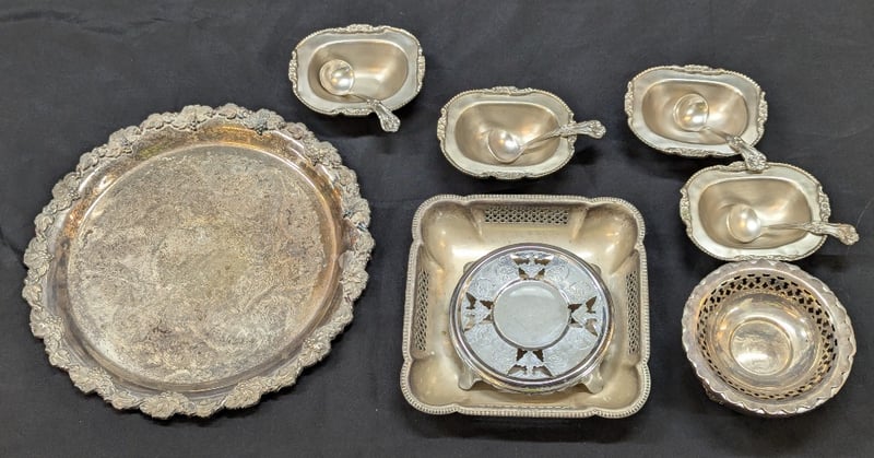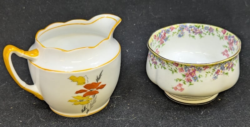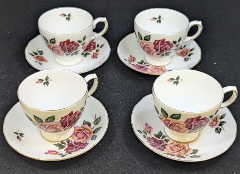 Including Royal Vale, Staffordshire, And Old English Rose Patterns. Includes Four Teacups With Saucers Decorated With Pink And Red Roses, Two Teapots, Serving Trays, Silver-Plated Serving Pieces, Salt Cellars, Cream Jugs, Sugar Bowls, And Rectangular Serving Platters. Mixed English Manufacturers