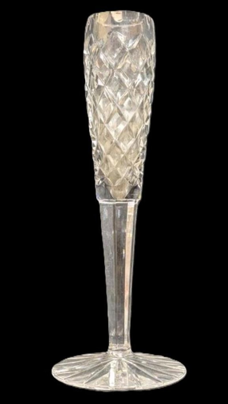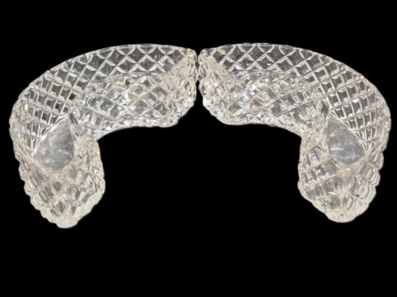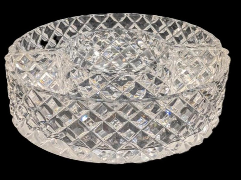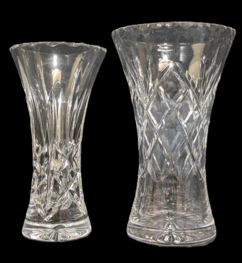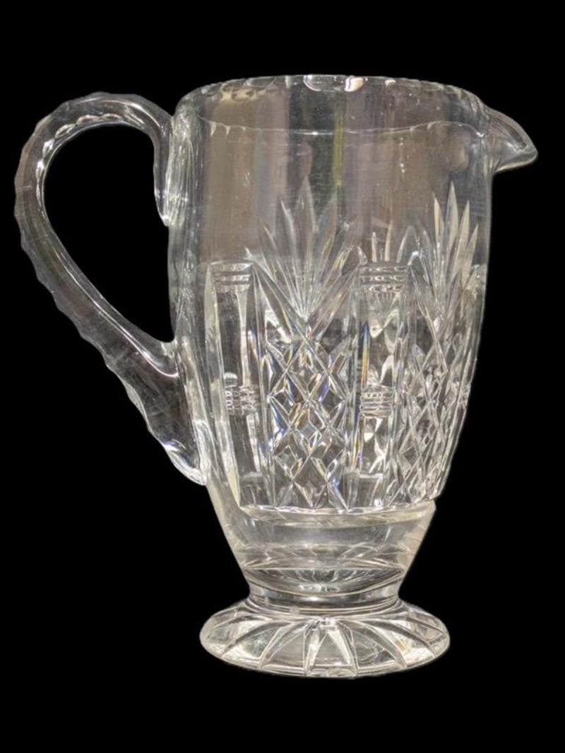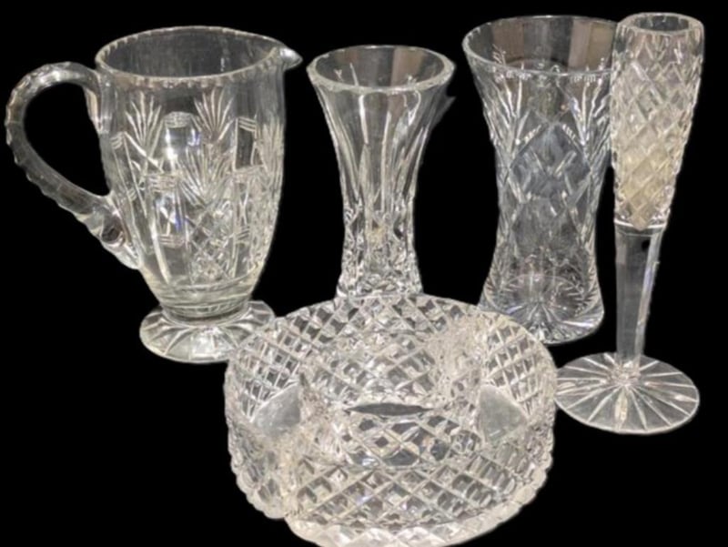 A mixed selection of clear cut-glass style pieces, including one handled jug, two vases, one long-stemmed decorative glass, and a round divided serving dish.