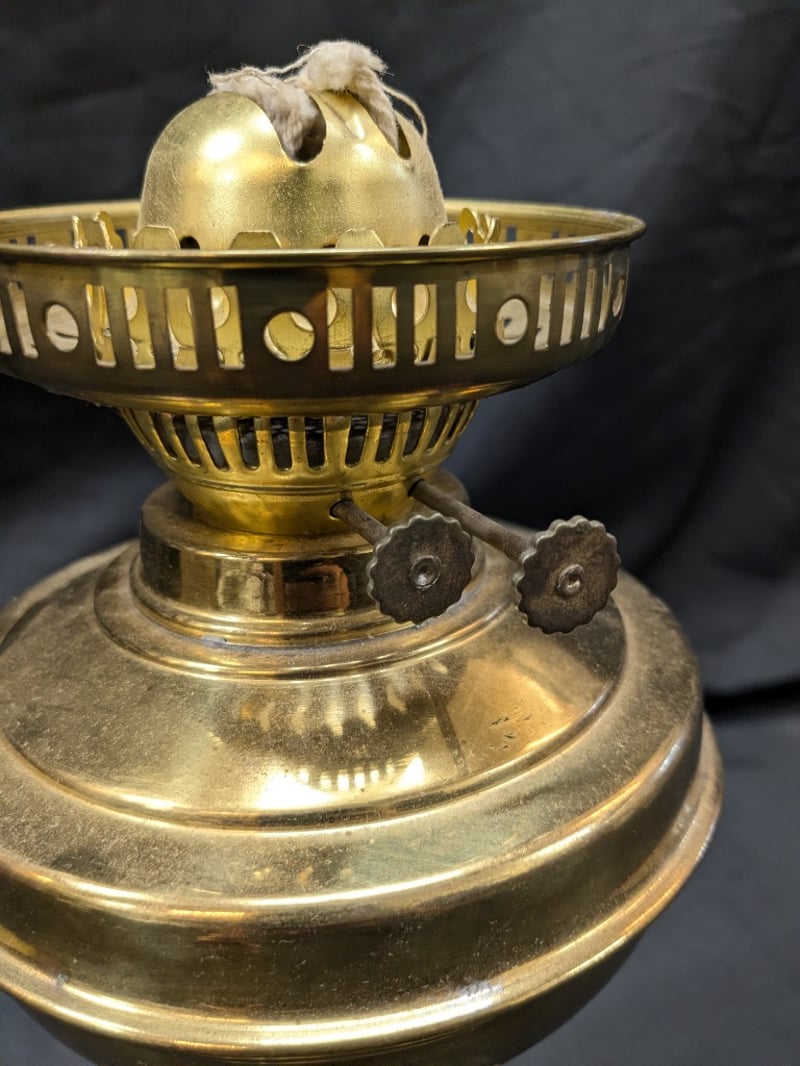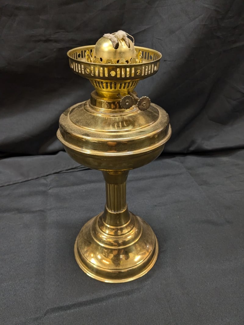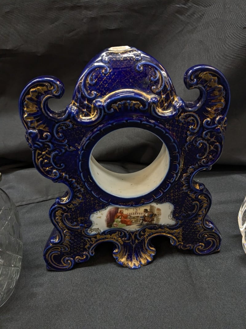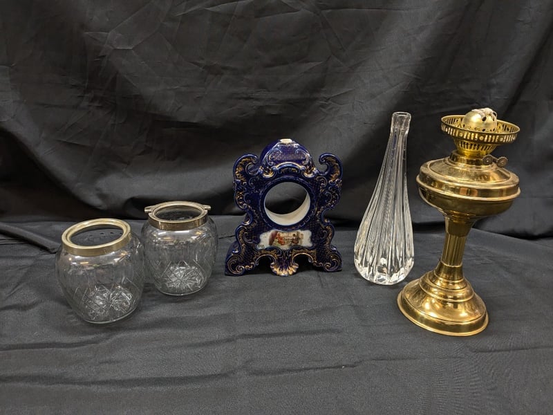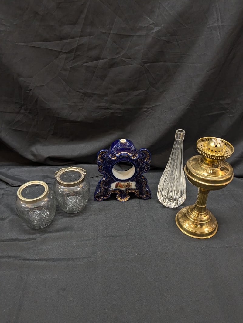 Includes Porcelian Mantel Clock Case, Brass Oil Lamp, Two Glass Jars, A Glass Stem Vase