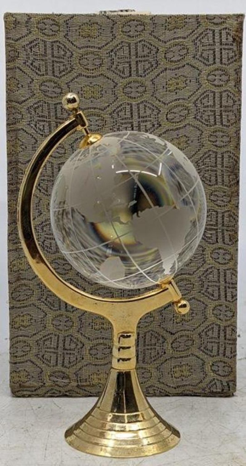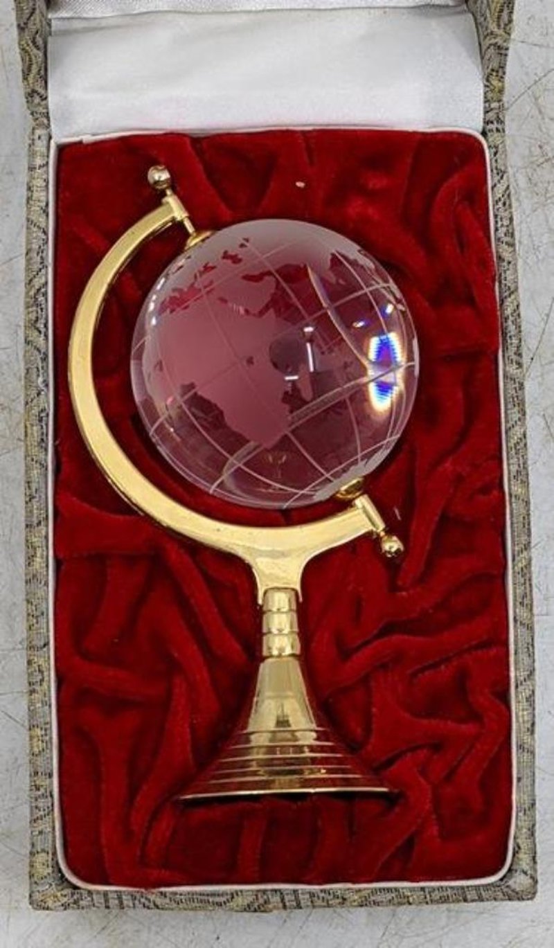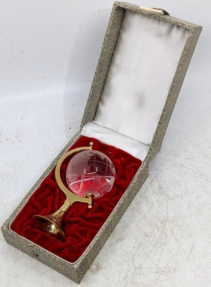 GLASS DISPLAY GLOBE ON POLISHED BRASS STAND COMES IN ORIGINAL BOX WITH RED INTERIOR Item Size: Height: 13.5cm, Width: 7cm, Depth: 6cm Dimensions Are For Globe Display