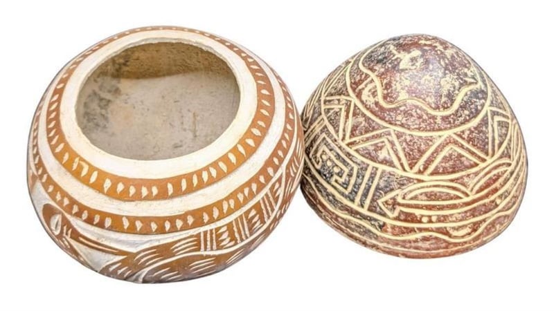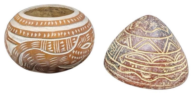 PAIR OF CARVED TRIBAL ORNAMENTS MADE OF FRUIT AND STONE Item Size: Height: 11cm, Width: 14cm, Depth: 14cm Condition: Good Provenance: Bedford Manor (Katoomba), Boutique Hotel Closure