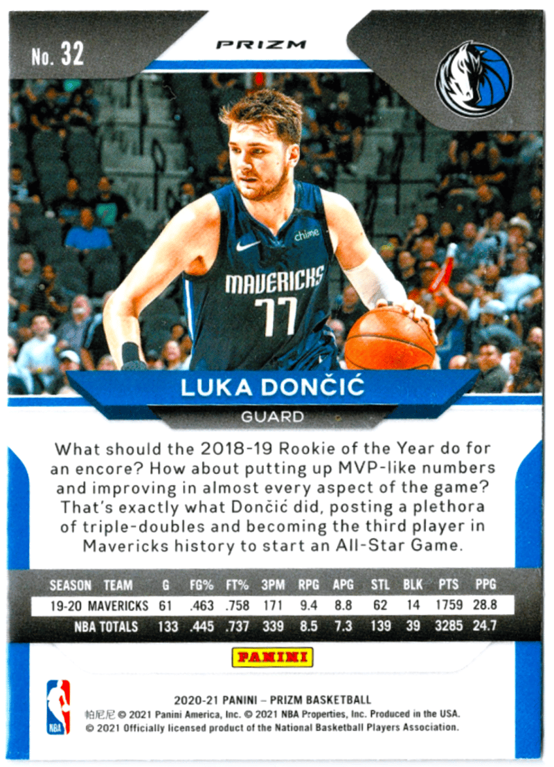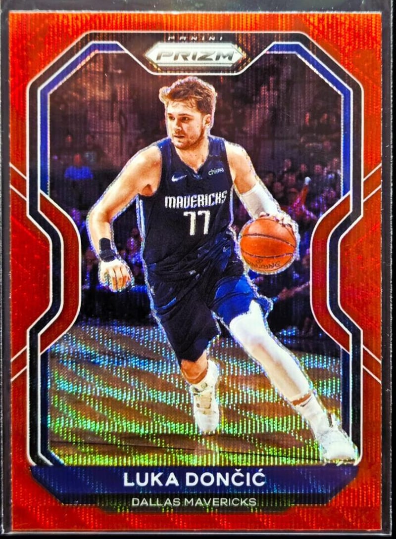 The 2020-21 Panini Prizm Red Wave Luka Dončić Card (#32) Exemplifies The High-End Aesthetic Of The Prizm Series, Combining Bold Red Refractive Tones With Precision Printing. Featuring Dončić In Full Dallas Mavericks Uniform, This Red Wave Parallel Showcases His Composure And Skill As One Of The Nba’S Elite Young Talents. Collectors Value This Card For Both Its Visual Distinction And The Continuing Rise Of Dončić’S Career. The Card Is In Exceptional Condition, Enhancing Its Display And Investment Appeal.