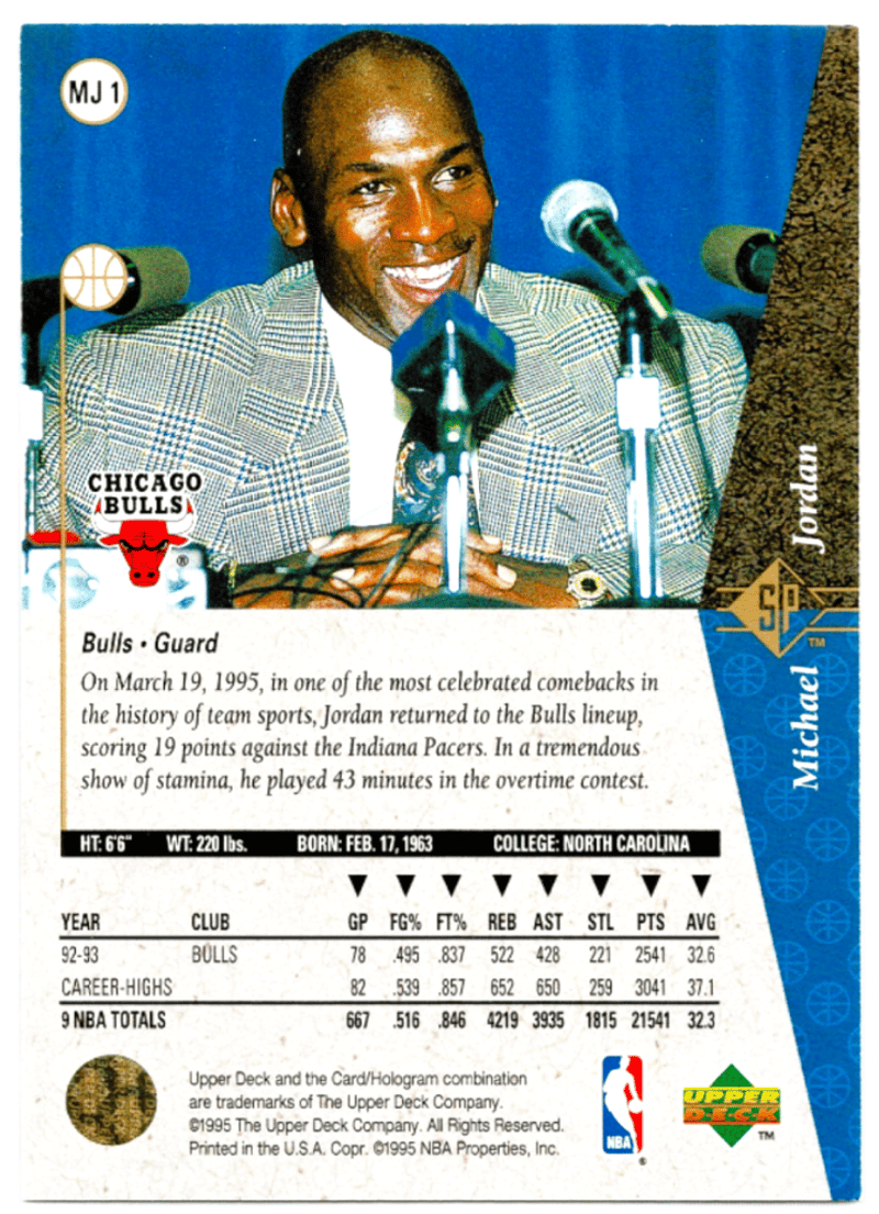 MICHAEL JORDAN 1995 UPPER DECK SP #MJ1 HOLOGRAM RED FOIL LABEL INSERT (CHICAGO BULLS)