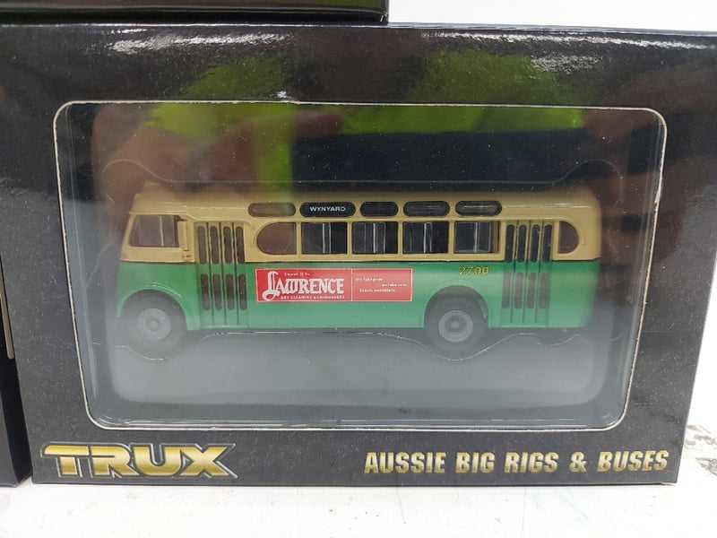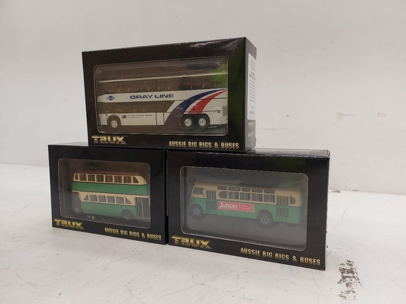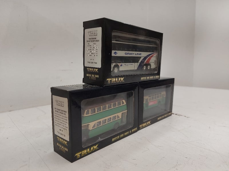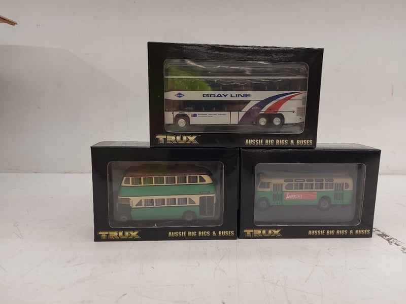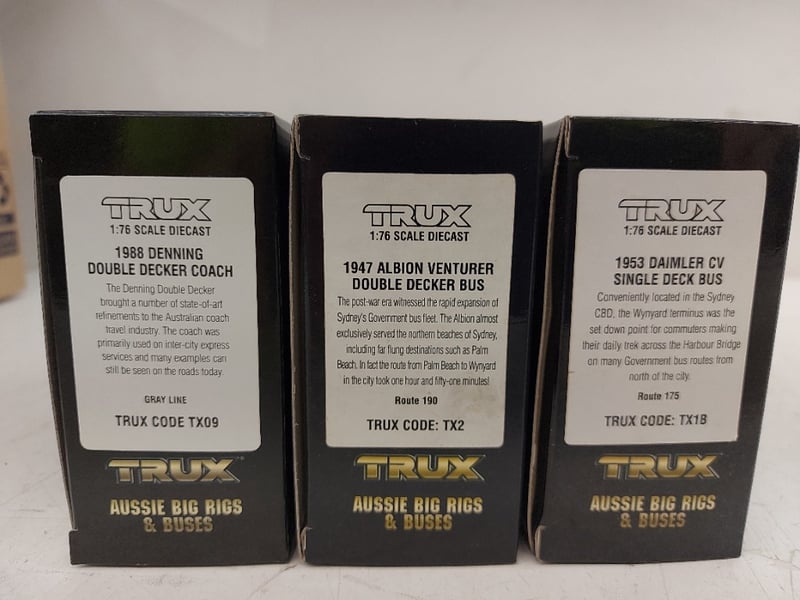 Model Buses, 1988 Denning Double Decker Coach, TC09, 1947 Albion Venturer, Double Decker Bus, TX2, 1953 Daimler CV Single Deck BUS, TC1B, TRUX, In Original Box, Diecast Scale 1:76, Quantity 3