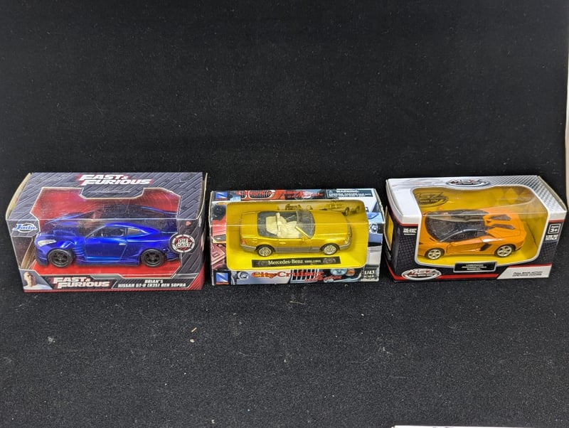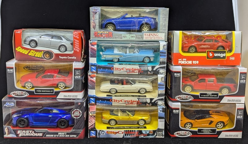 TEN MODEL CARS, SCALE APPROX 1:43Cars Include Jada Fast And Furious Die Cast 'Brians Nissan Gt-R, Msz Lamborghini Aventador, City Cruiser Mercedes Benz, Deluxe Racer Die Cast Car, EtcCondition: Good - Refer To Images584959+2