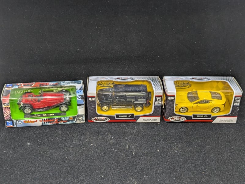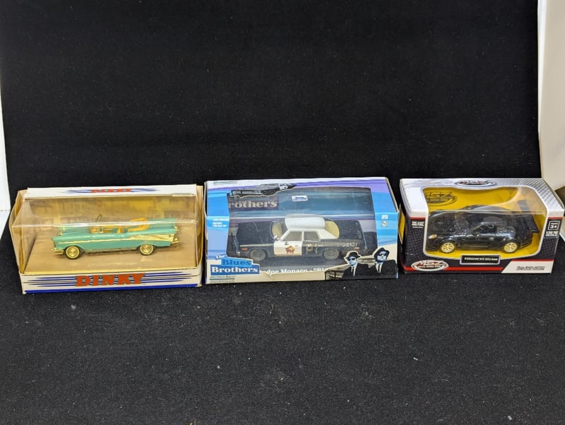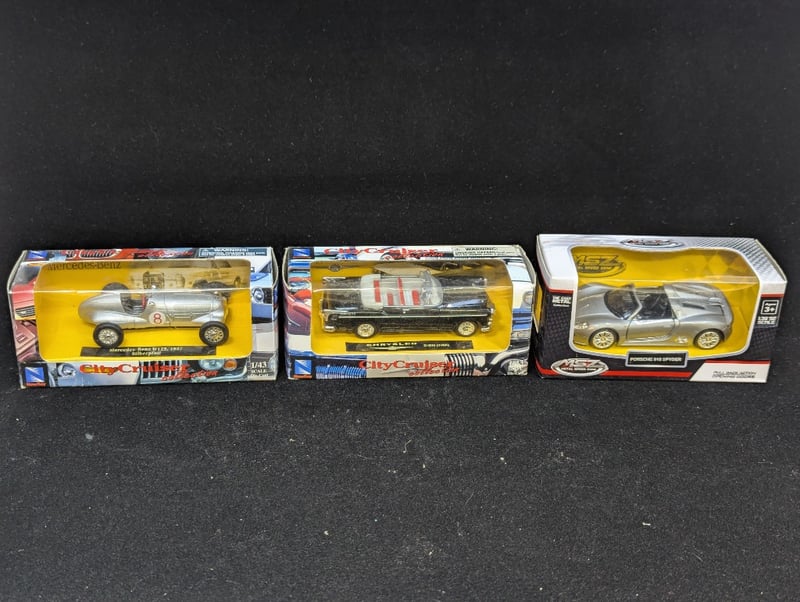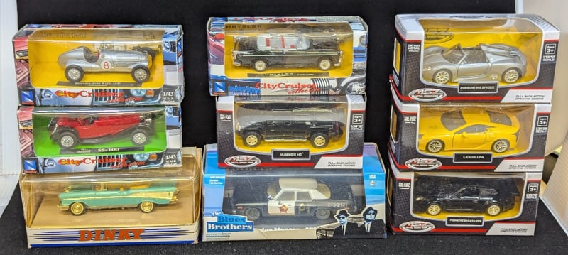Cars Include Matchbox Dinky 1957 Chevrolet Convertible, Msz Porsche 911 Gt3 Rsr, Msz Lexus Lfa, City Cruiser Jaguar Ss-100, City Cruiser Chrysler C-300 (1955), The Blues Brothers Dodge Monaco, Etc