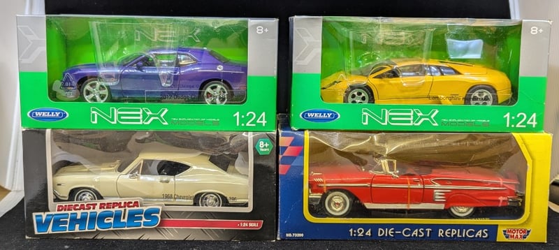 FOUR 1:24 SCALE MODEL CARSIncludes Diecast Replica Vehicles 1968 Chrvrolet Chevelle Ss 396, Motor Max 1058 Chevrolet Impala Convertible, Welly Nex 2012 Dodge Challenger Srt, Welly Nex Lamborghini MurcielagoCondition: Good - Refer To Images584959+6