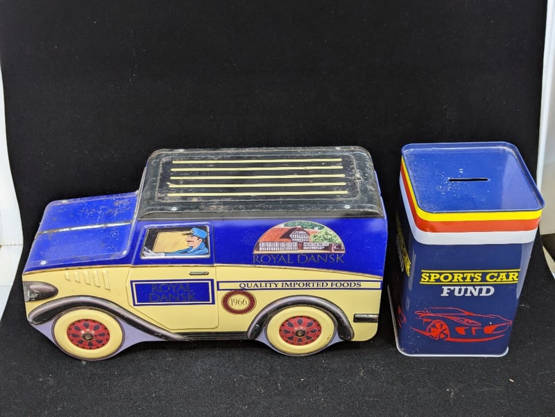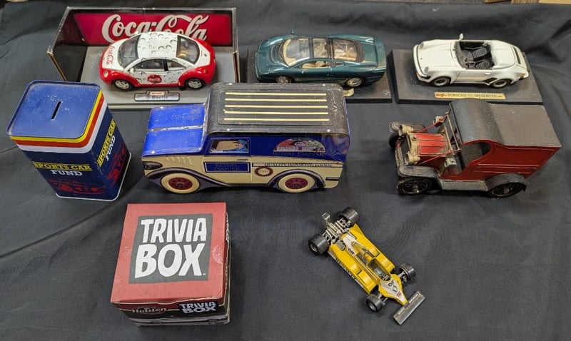 COLLECTION OF MODEL CARS, TINS AND HOLDEN TRIVIA BOXVarious Models Of Cars On Plastic Bases Including Coca Cola Vw Beetle, Jaguar Xd220, Porsche 911 Speedster,Burago Renault Re 30 1/24 Scale Car, Sports Car Fund Money Box, Royal Dansk Tin In Shape Of Delivery Van, Holden Trivia Box584959+9