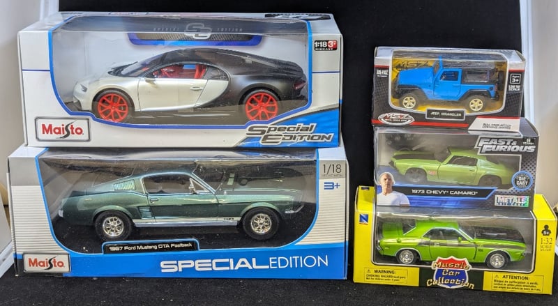 Scales Range From Approx 1:18 - 1:39, Cars Include 1967 Ford Mustang, Bugatti Chiron, Jeep Wranger, 1970 Challenger T/A, 1973 Chevy Camaro