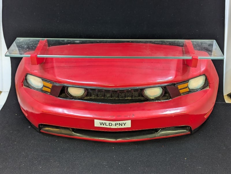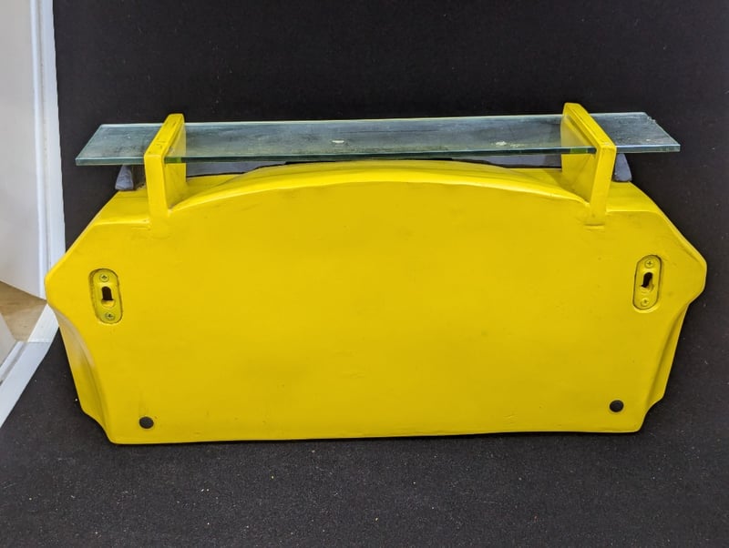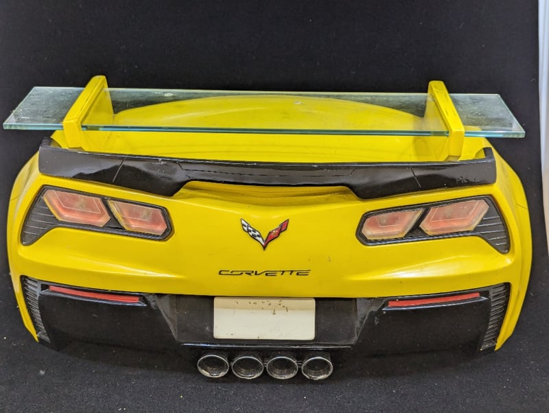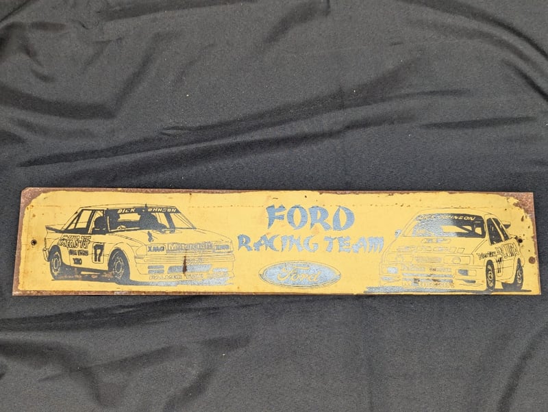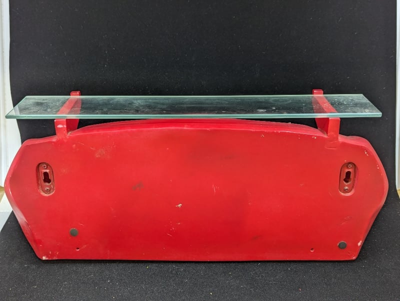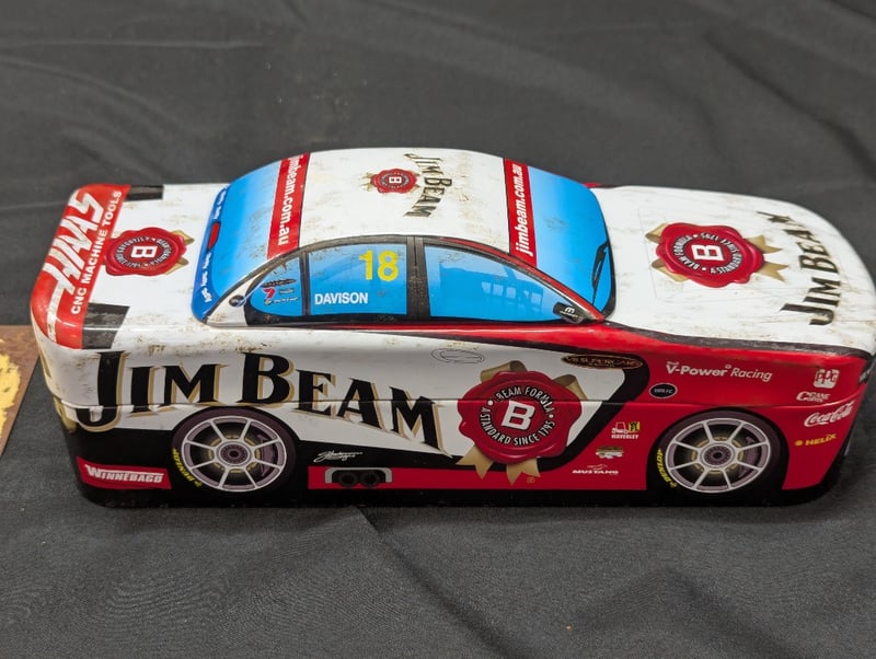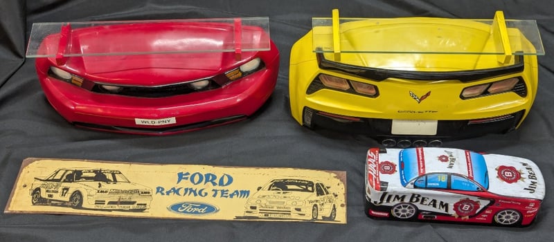 COLLECTION OF DECORATIVE AUTOMOBILE ITEMSIncludes Two Car Themed Wall Mounted Decoration With Glass Shelve (Size Approx: 23Cm H X 46Cm W), Jim Beam Car Tin, Ford Racing Decorative Metal Sign584959+31