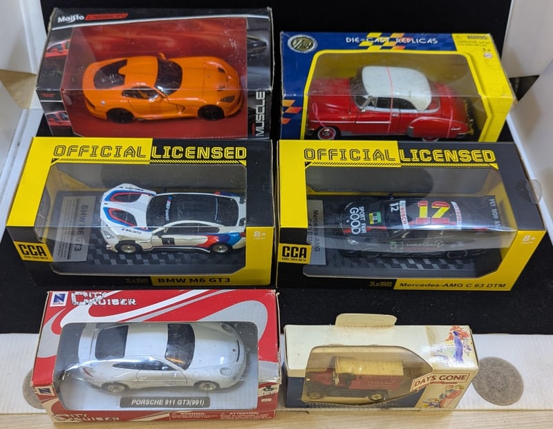Cars Include Maisto Design 1:24 Scale 2013 Srt Viper Gts, 1950 Chevy Bel Air, Cca 1:32 Scale Bmw M6 Gt3, Cca 1:32 Scale Mercedes Amg C 63 Dtm, City Cruiser Porsche 911 Gt3(991), Days Gone Renault Van