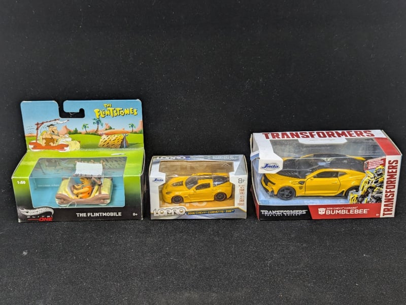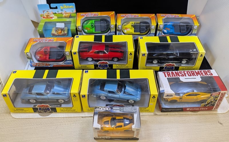 Cars Include The Flintstones 'The Flintmobile', Four Bumper Car Models, Four Muscle Car Collection 1:32 Scale Models, Transformers Bumblebee, Etc