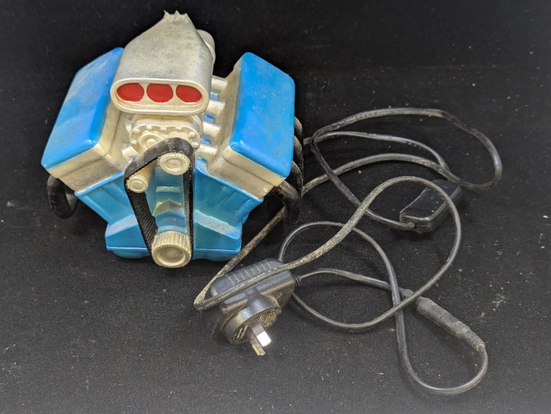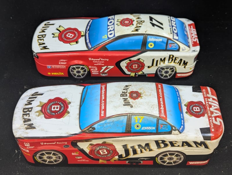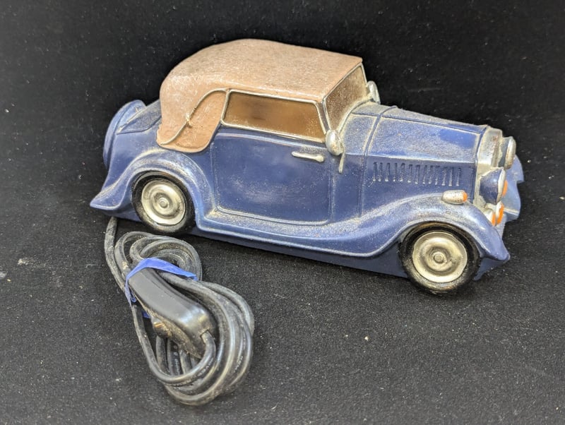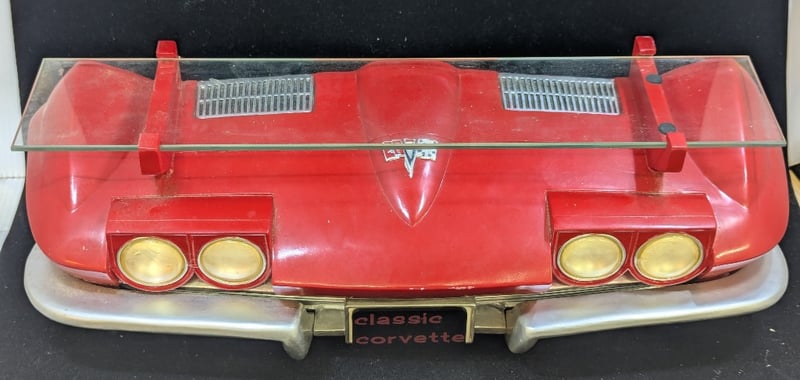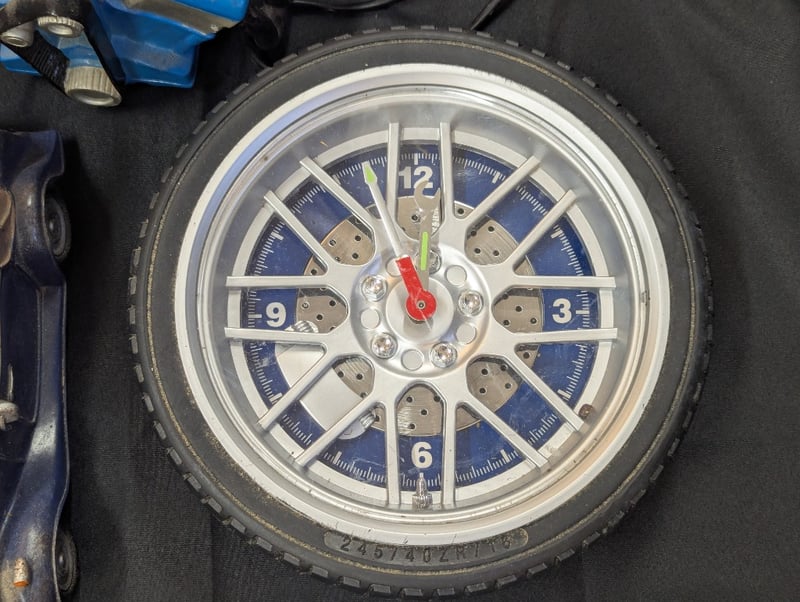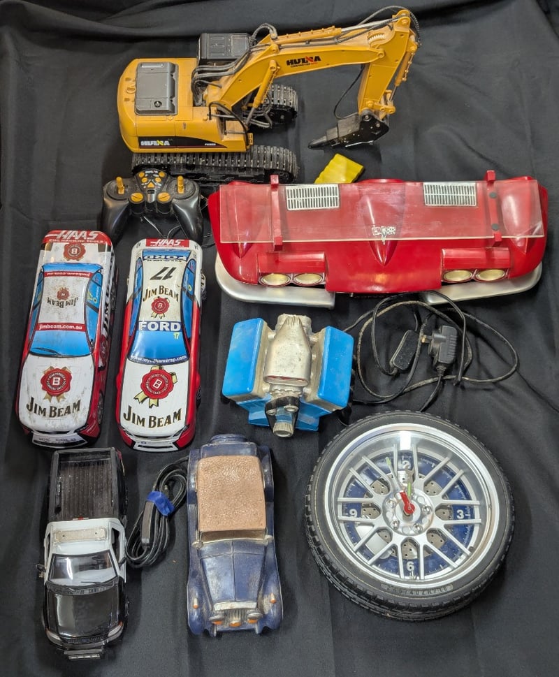 COLLECTION OF AUTOMOBILE ITEMS INCLUDING TIRE THEMED CLOCK, JIIM BEAM CAR TINS, WALL MOUNTED CAR FRONT WITH GLASS SHELF, ELECTRIC CAR MODELS, REMOTE CONTROLLED COSNTRUCTION VEHICLE